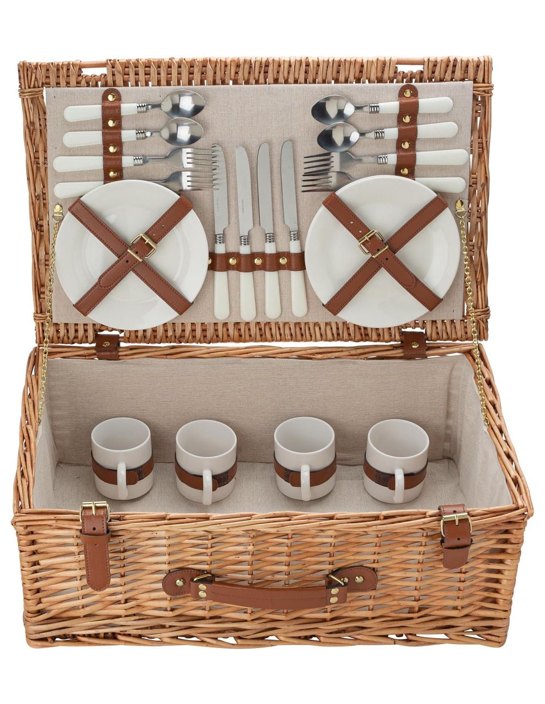 Cesta de picnic para 4 personas. Incluye cubiertos de acero inoxidable, platos y tazas (0,21ml) de cerámica. Producto hecho con materiales naturales, pueden haber diferencias en color y tamaño.