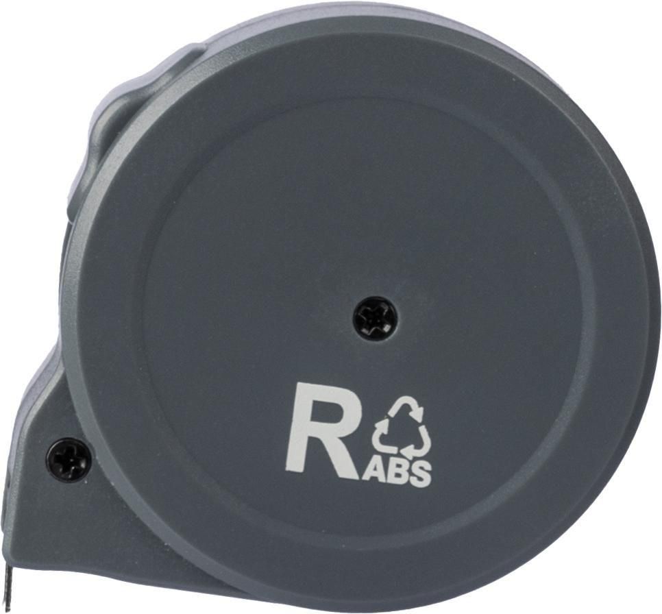 Cinta métrica de ABS reciclada (3 metros) con una escala en centímetros y pulgadas. Incluye el logotipo grabado de ABS reciclado. Presentada en una caja de cartón marrón.