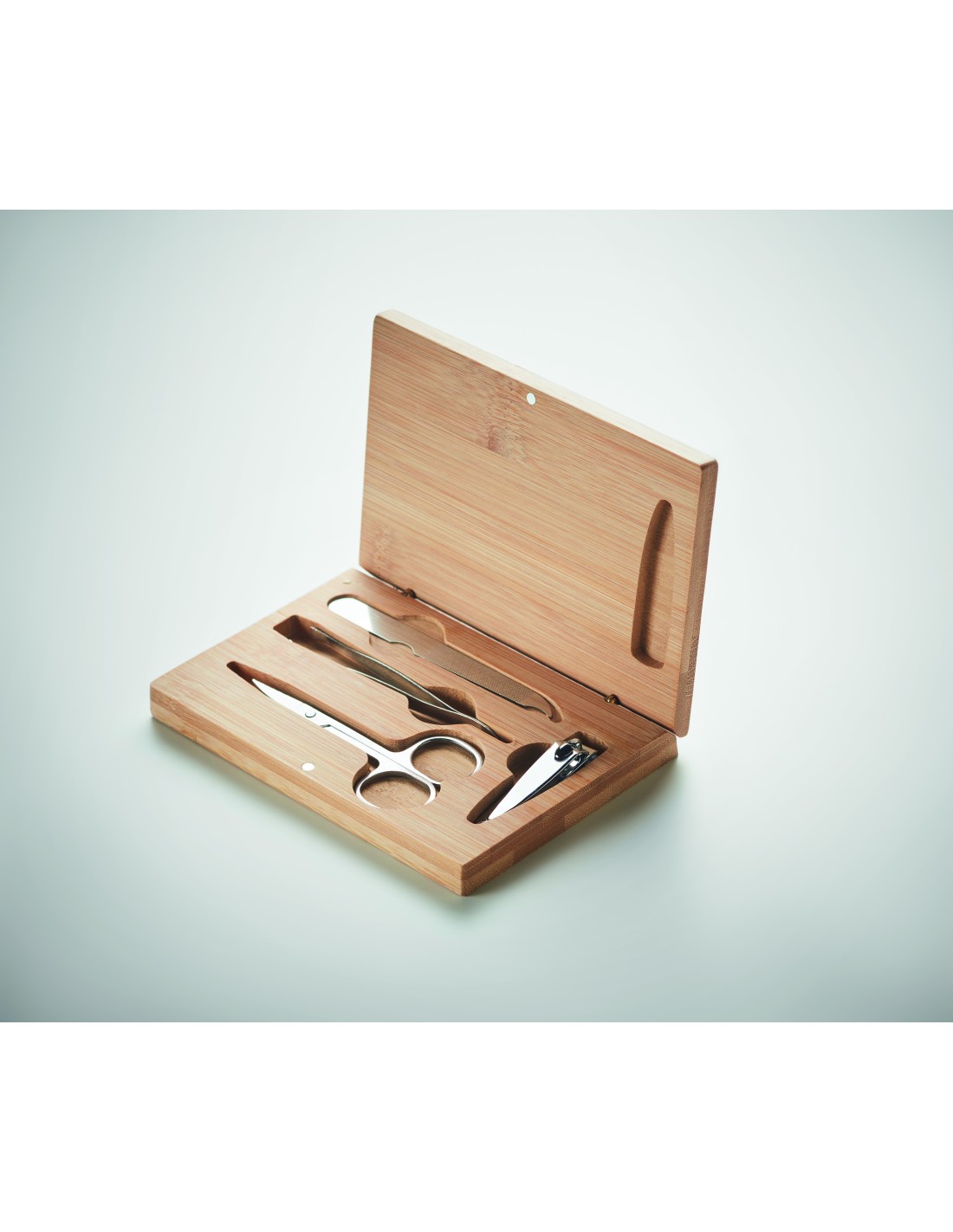 Set de manicura de 4 piezas de acero inoxidable en un estuche de bambú con cierre magnético. Incluye: tijeras de uñas curvas, cortaúñas, lima de uñas y pinzas. El bambú es material natural, el color del articulo puede variar.