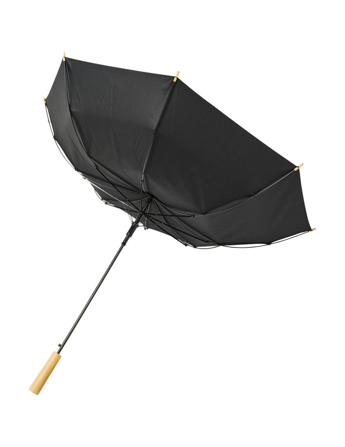 Paraguas de apertura automática con capa externa de poliéster de tafetán de tereftalato de polietileno reciclado. Eje metálico robusto y estructura de alta calidad con varillas de fibra de vidrio que ofrece flexibilidad en condiciones de viento. Se trata de una opción más sostenible gracias al mango de madera, las puntas de las varillas y la capa externa de poliéster de tafetán de tereftalato de polietileno reciclado. Disponible en una amplia variedad de colores contemporáneos con una gran zona de decoración en cada uno de los paneles.