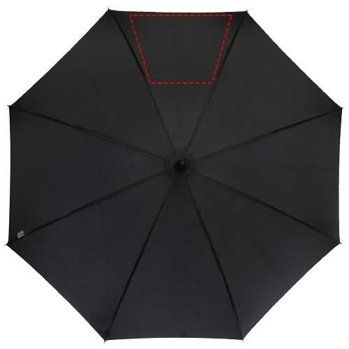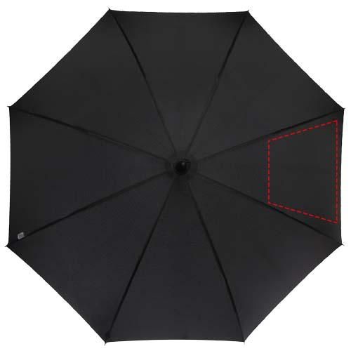 Paraguas de apertura automática con capa externa de poliéster Pongee, y un robusto eje de metal chapado en negro. La estructura de fibra de vidrio de alta calidad ofrece la máxima flexibilidad en condiciones de viento. Mango curvo con acabado de aspecto de fibra de carbono y puntas negras niqueladas. Detalles en la etiqueta tejida de la capa externa y en la cinta de cierre. Amplia zona de grabación en cada uno de los paneles.
