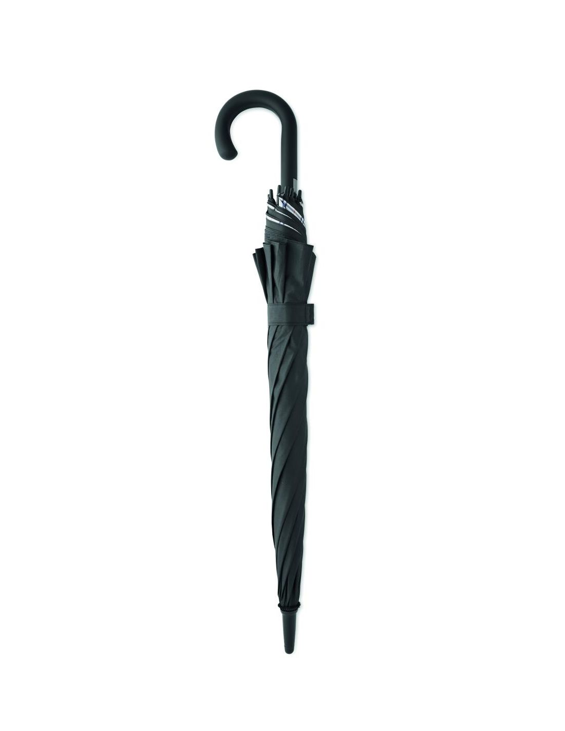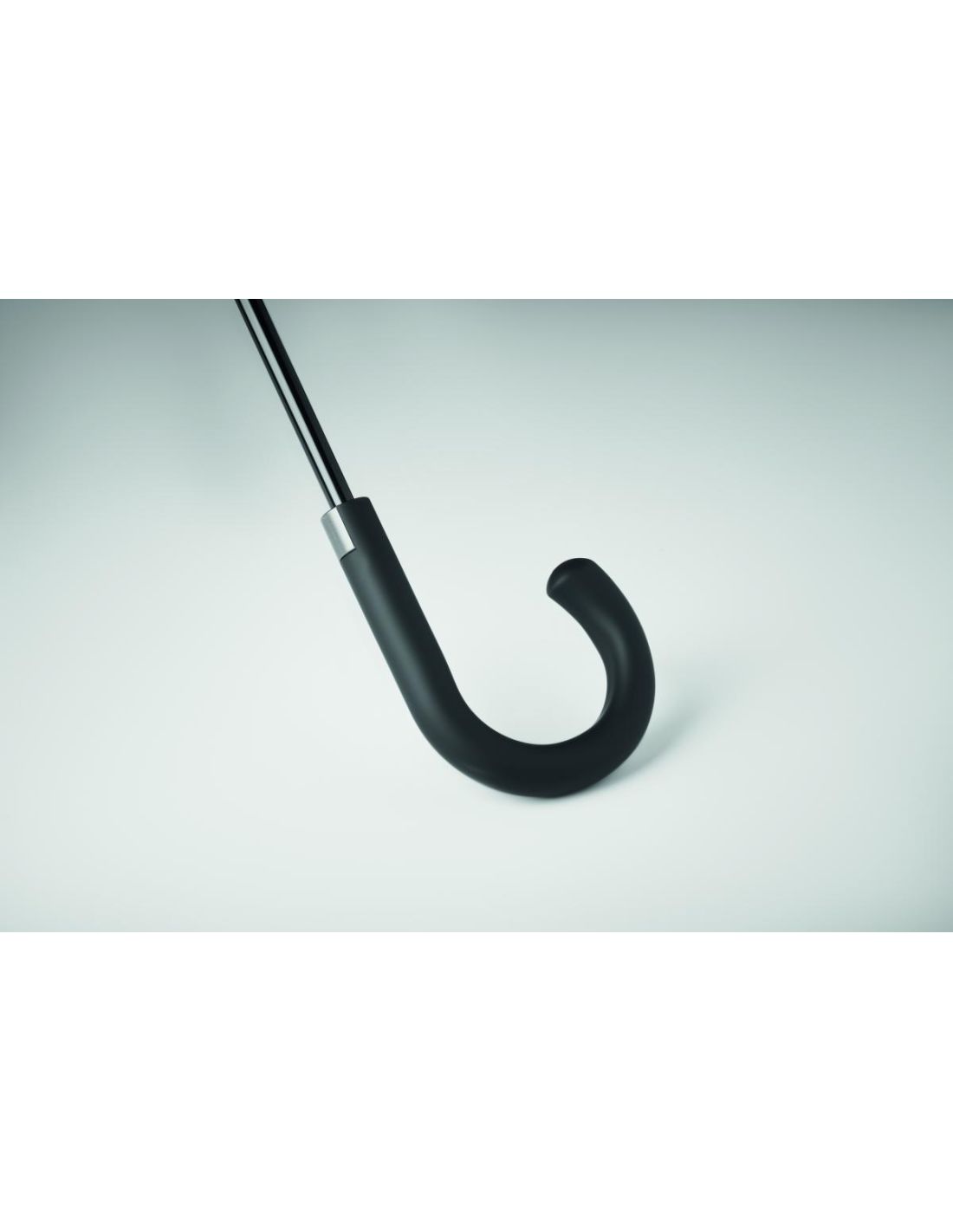 Paraguas de 23'' antiviento y de apertura automática en pongee 190T con diseño interior a cuadros. Estructura de fibra de vidrio con eje chapado en negro y puntas de plástico. Mango curvado acabado en goma. Cierre manual.