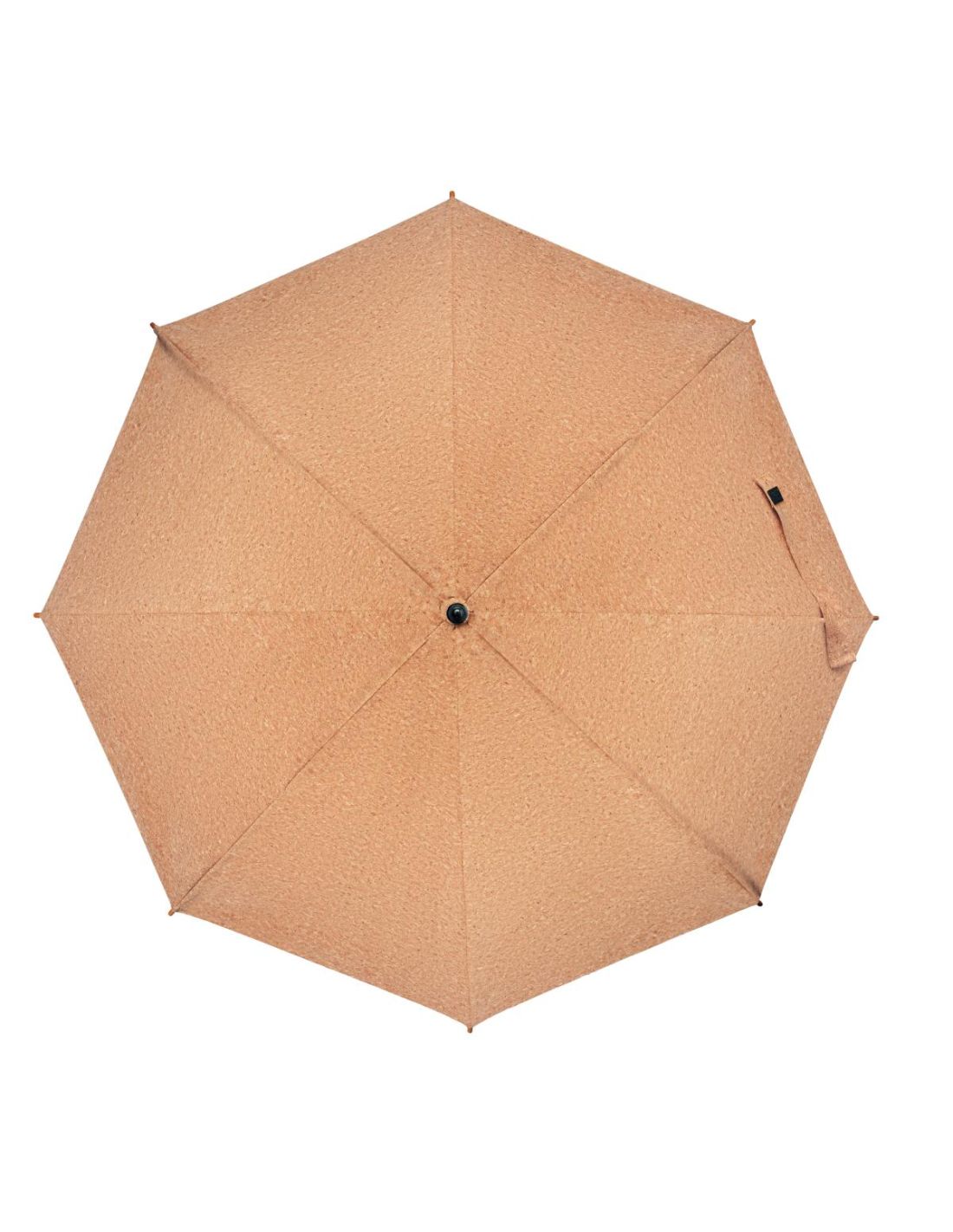 Paraguas de 25 de corcho de apertura automática con eje de bambú y mango de madera contrachapada, varillas de fibra de vidrio. Puntas y parte superior de plástico negro. Cierre manual. El corcho es un material natural, debido a su naturaleza estructural y porosidad superficial, el resultado final de la impresión por artículo puede tener desviaciones.