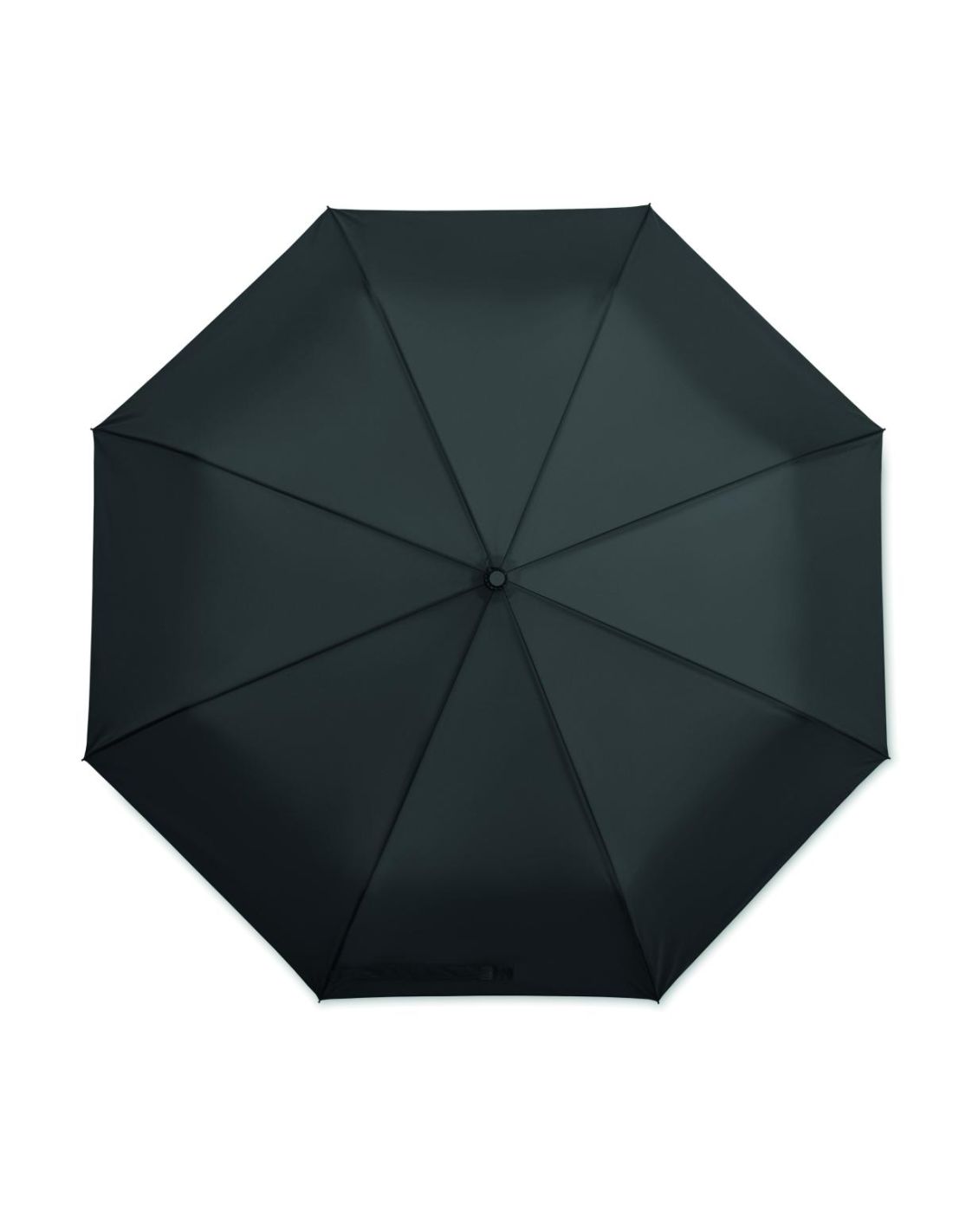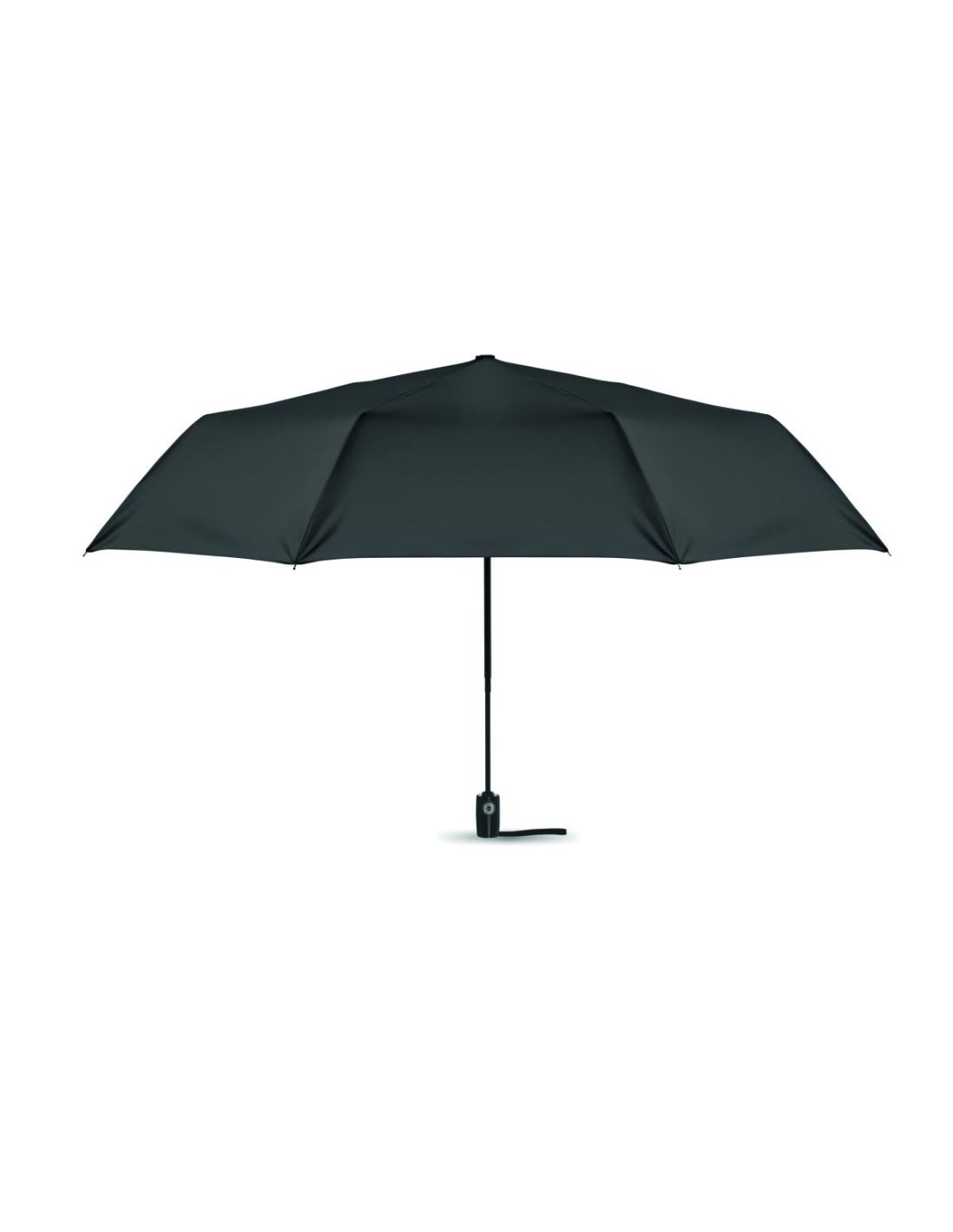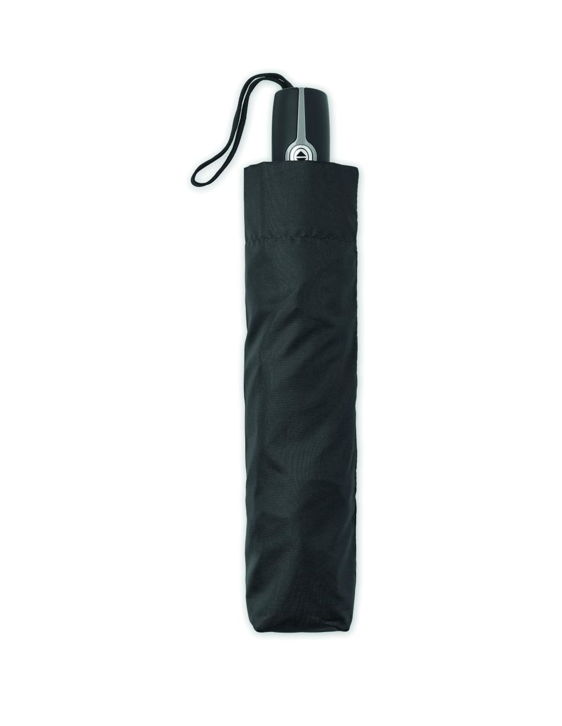 Paraguas plegable de 27'' con apertura y cierre automático de pongee 190T. Anti viento. Eje de acero chapado negro. Varillas de fibra de vidrio. Mango de PP negro con pulsador. Con bolsa a juego.