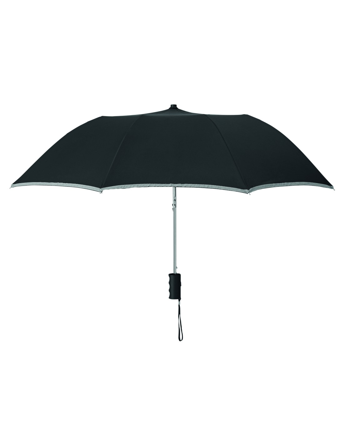 Paraguas plegable de 21'' de apertura automática fabricado en poliéster con acabado pongee y con ribete reflectante. Mango de plástico. Incluye asa para transporte y funda a juego. Cierre manual.
