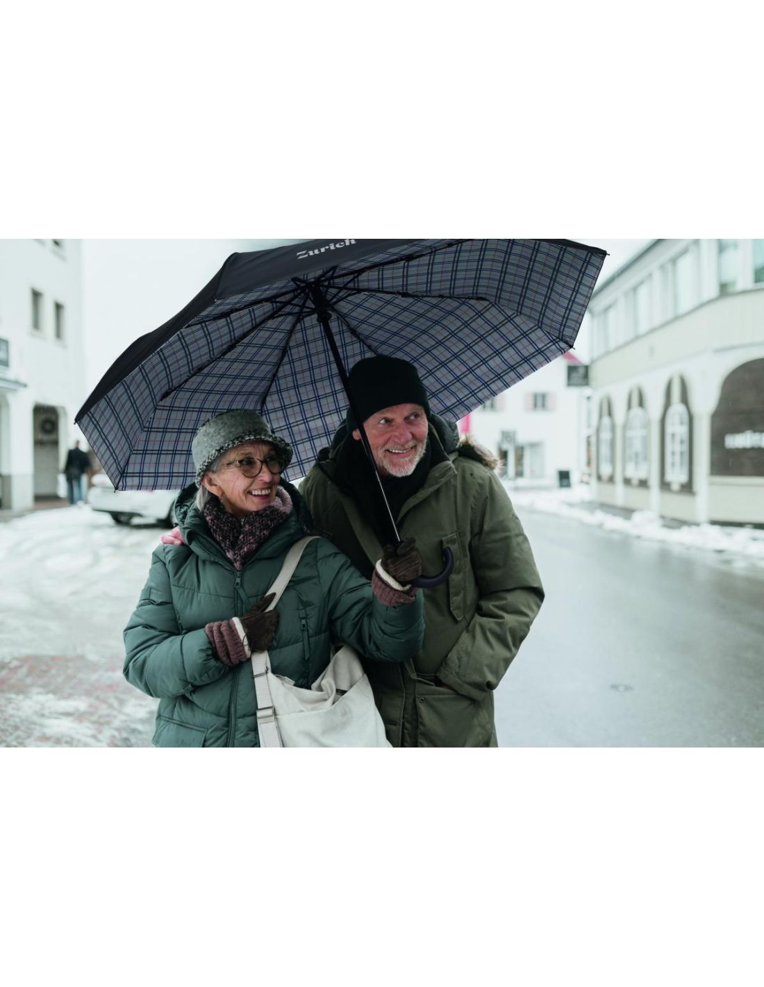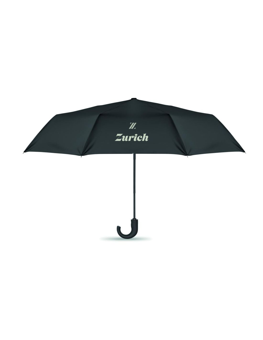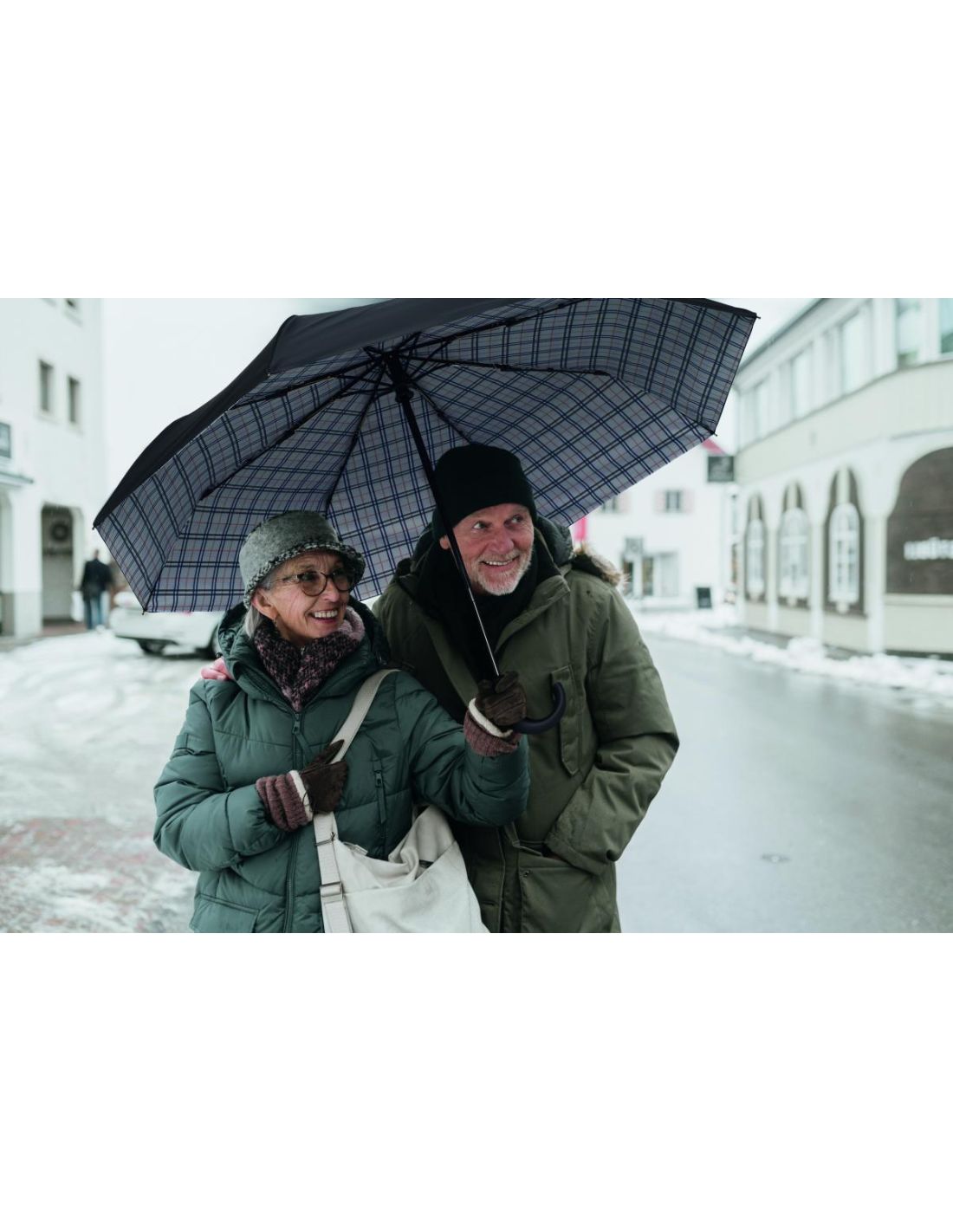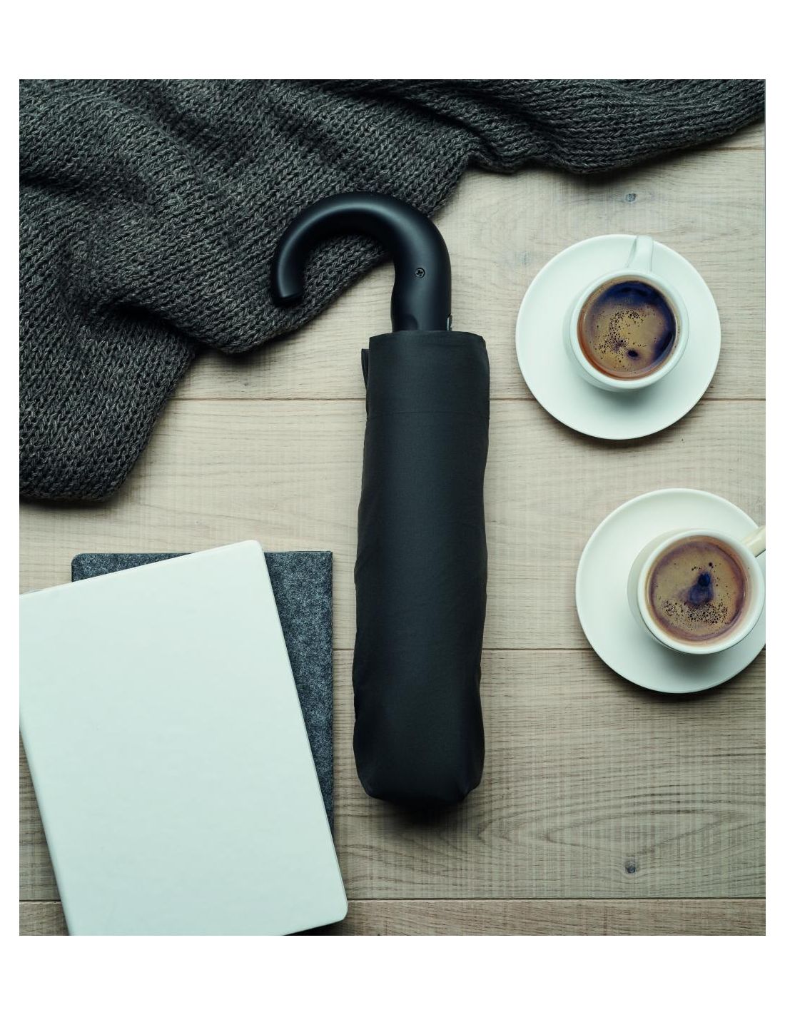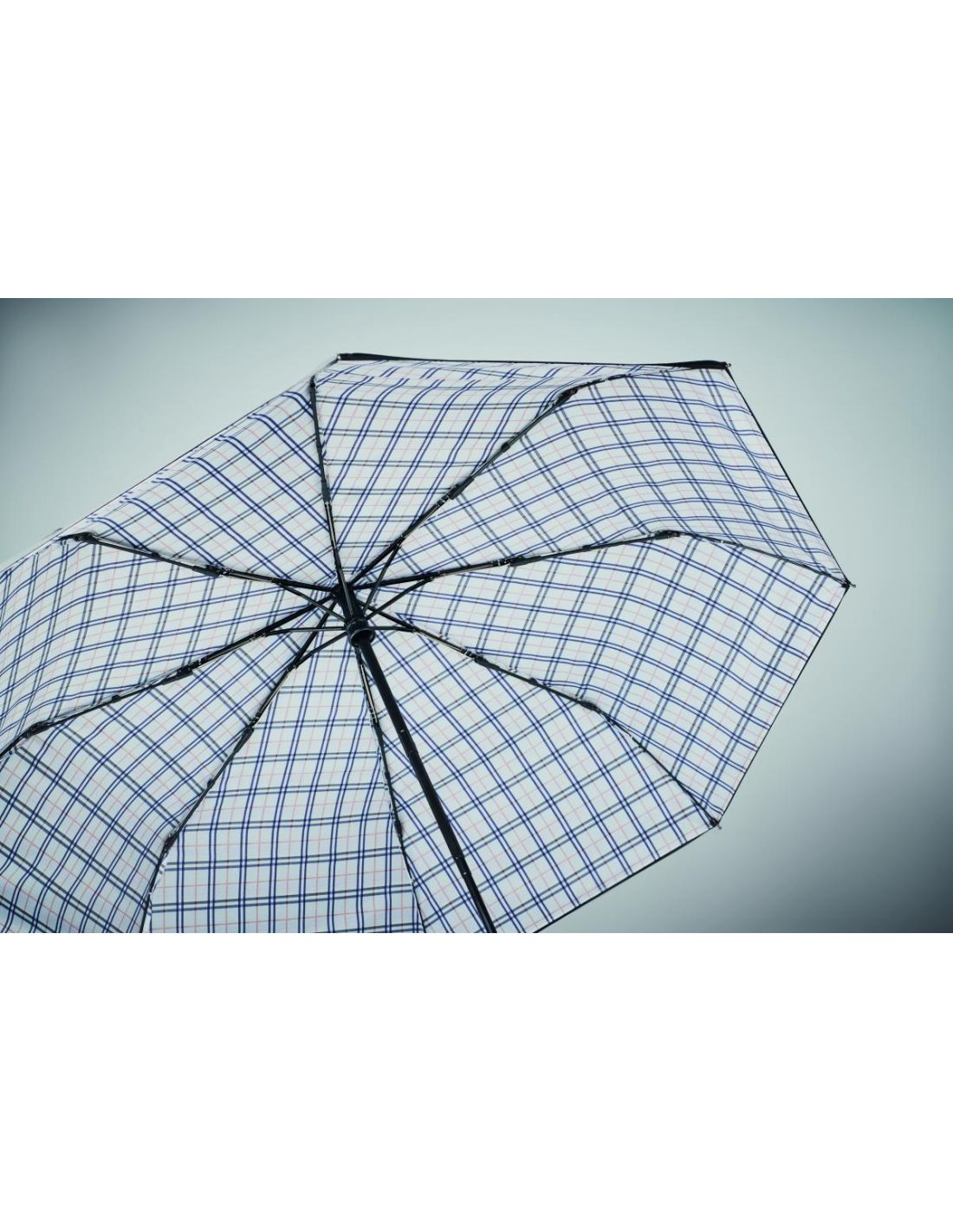 Paraguas de 23'' plegable 3 tiempos, antiviento con apertura y cierre automáticos, en pongee 190T de doble capa con diseño interior a cuadros. Estructura y eje chapados en negro. Parte central de dos secciones de fibra de vidrio negra niquelada. Mango curvado de madera.