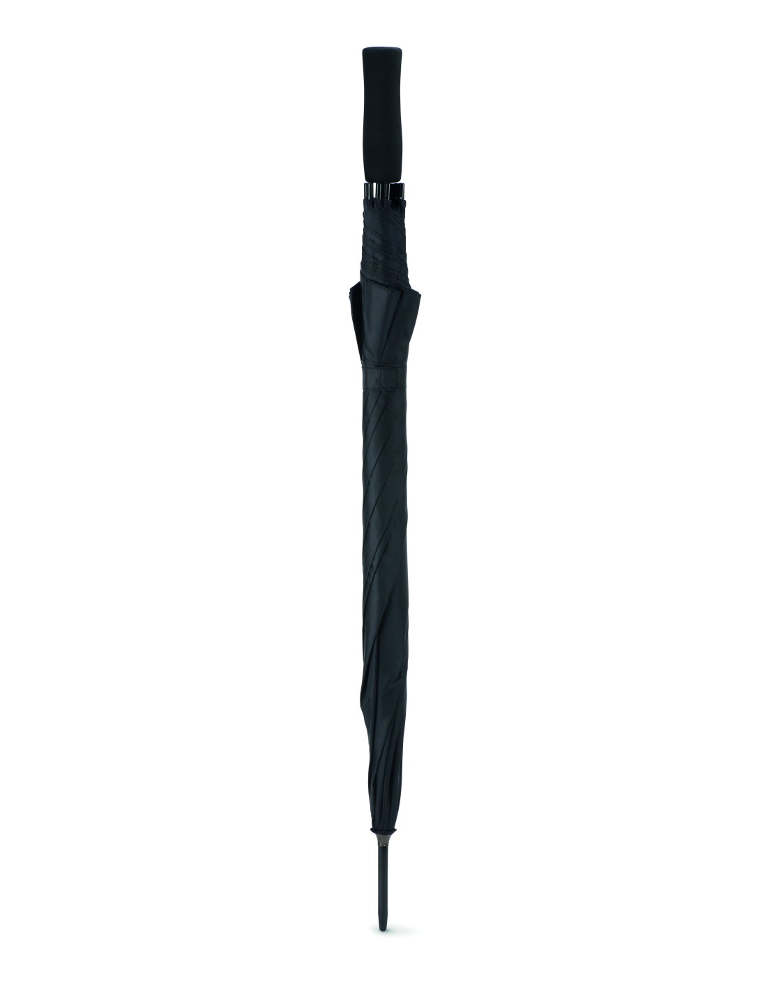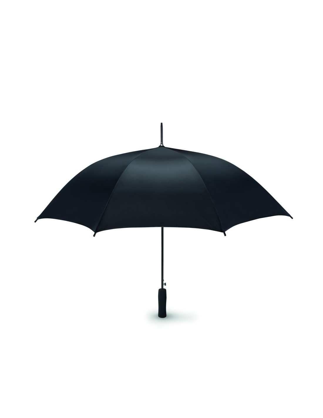 Paraguas de apertura automática en pongee 190T con caña y costillas en chapado metálico negro. Puntas en plástico negro. Mango de EVA.