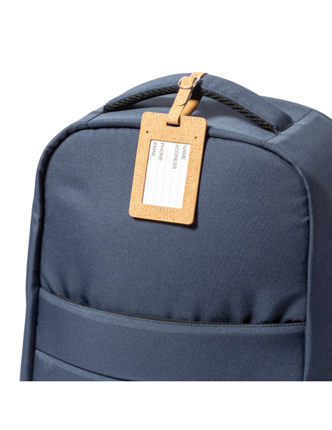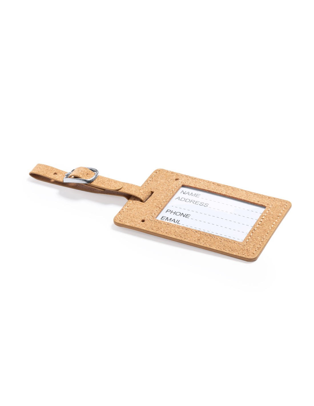 Identificador para maletas de línea nature fabricado en corcho natural. Cinta de acople con cierre de hebilla metálica y tarjeta de identificación en inglés.