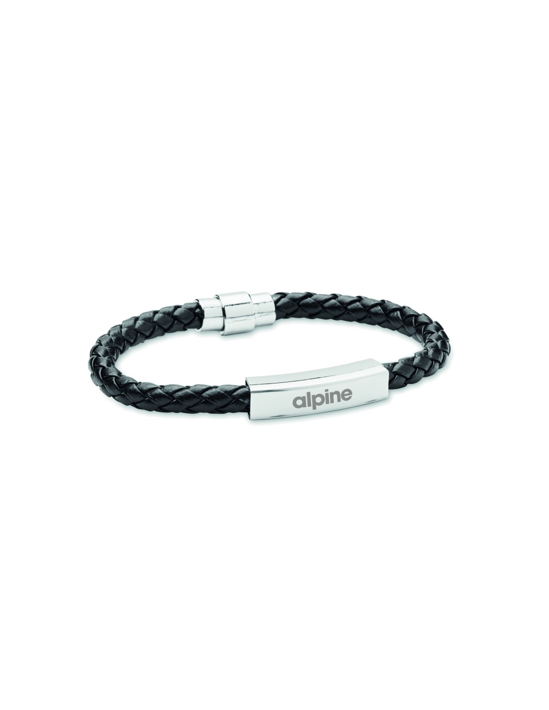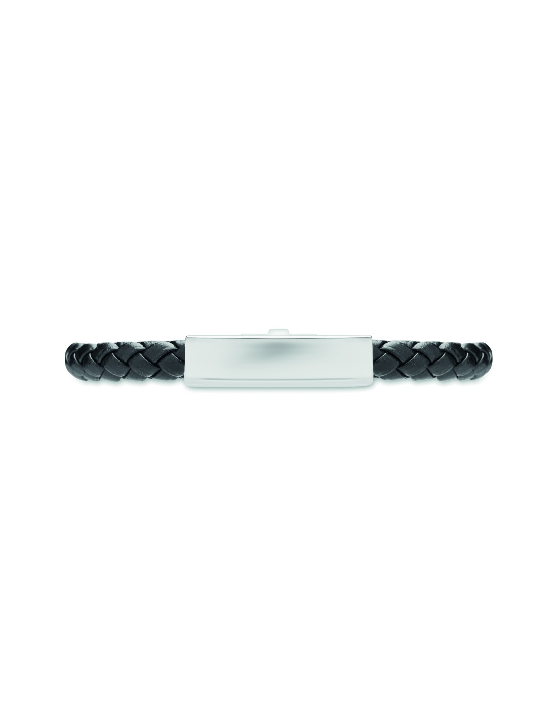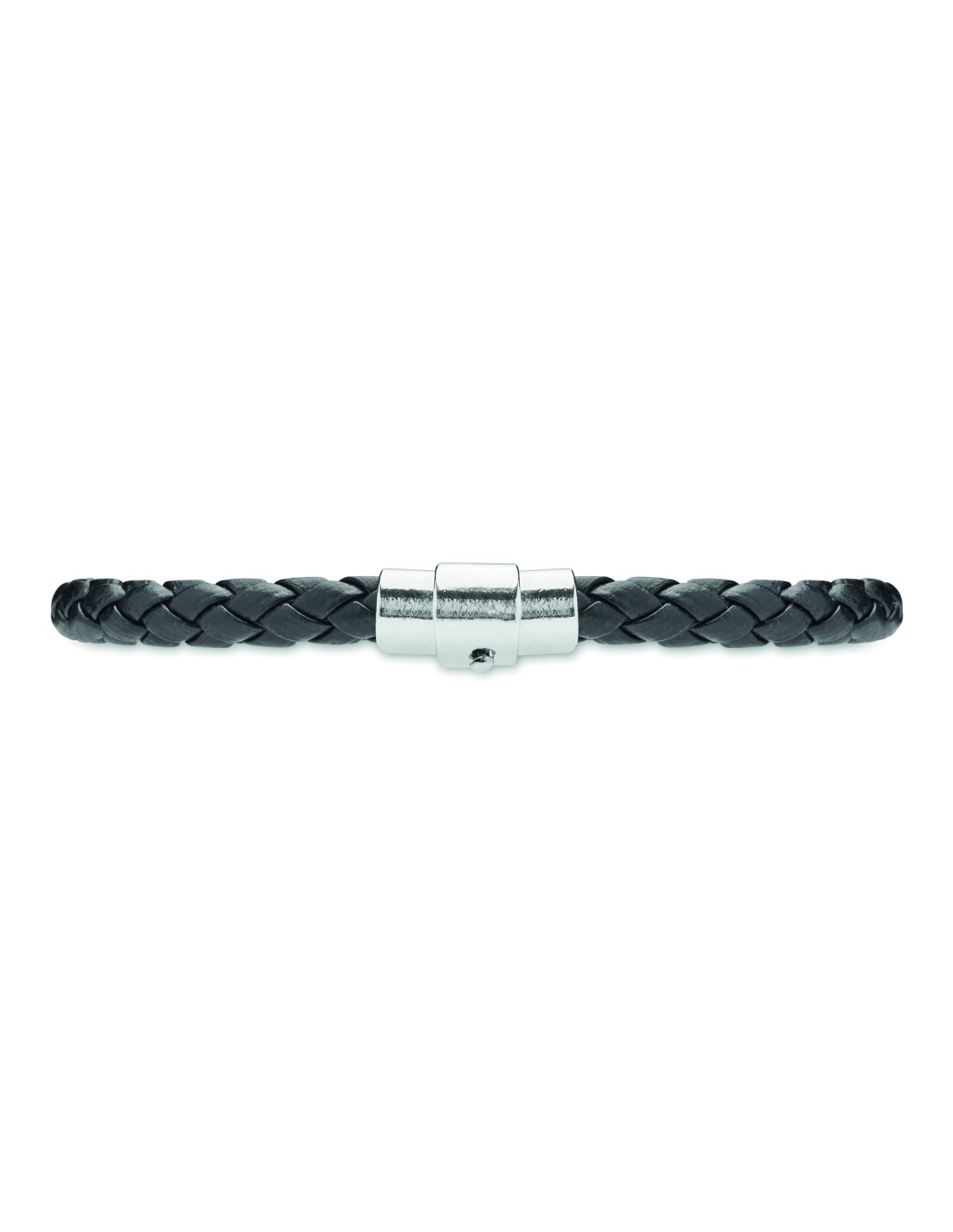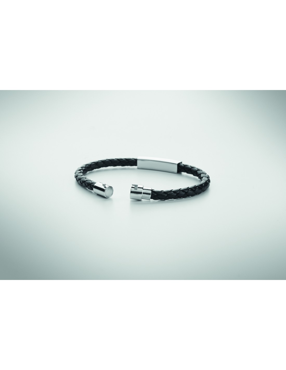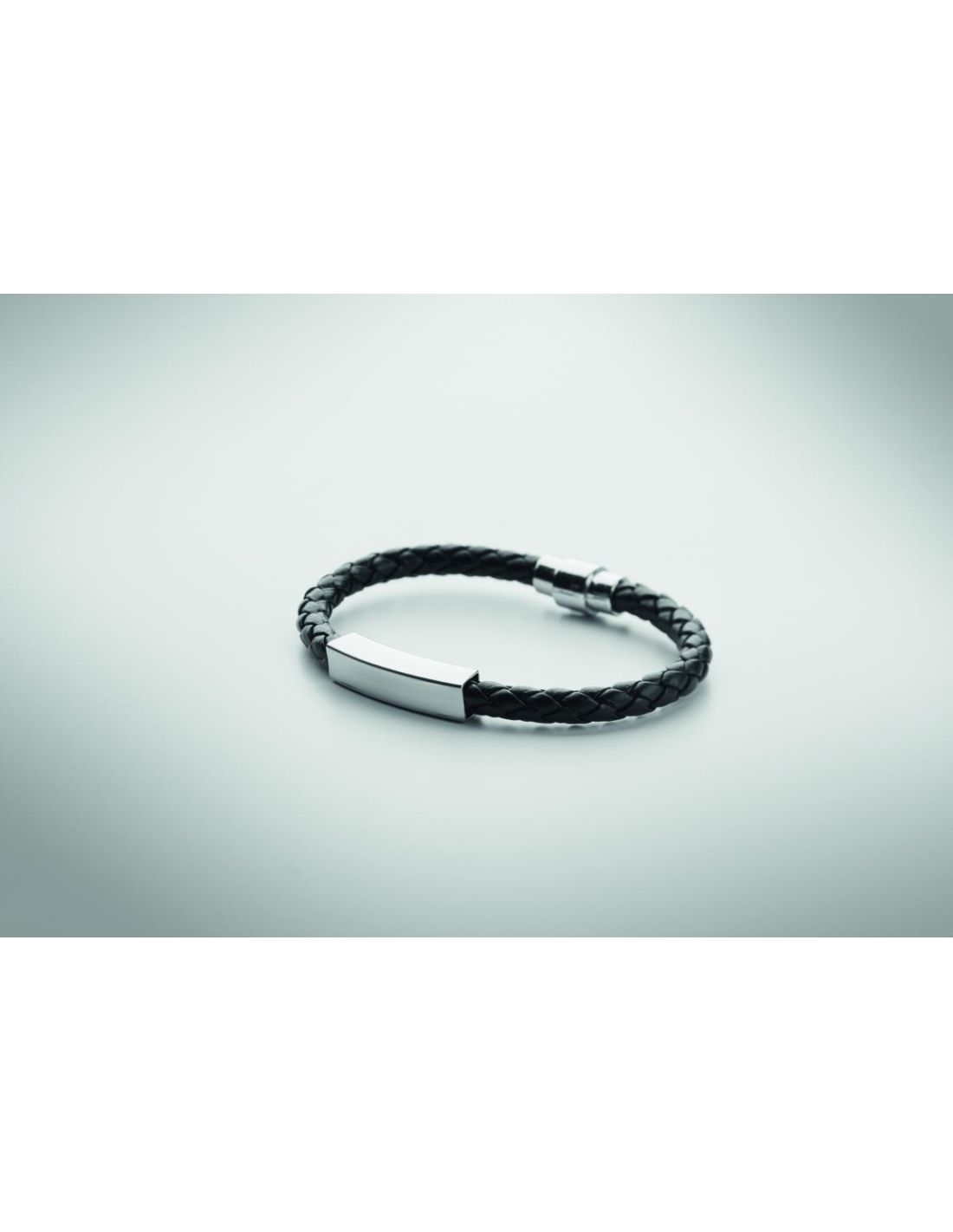 Brazalete trenzado de piel sintética con herrajes de acero pulido. Cierre de presión. Circunferencia de la muñeca: 19 cm.