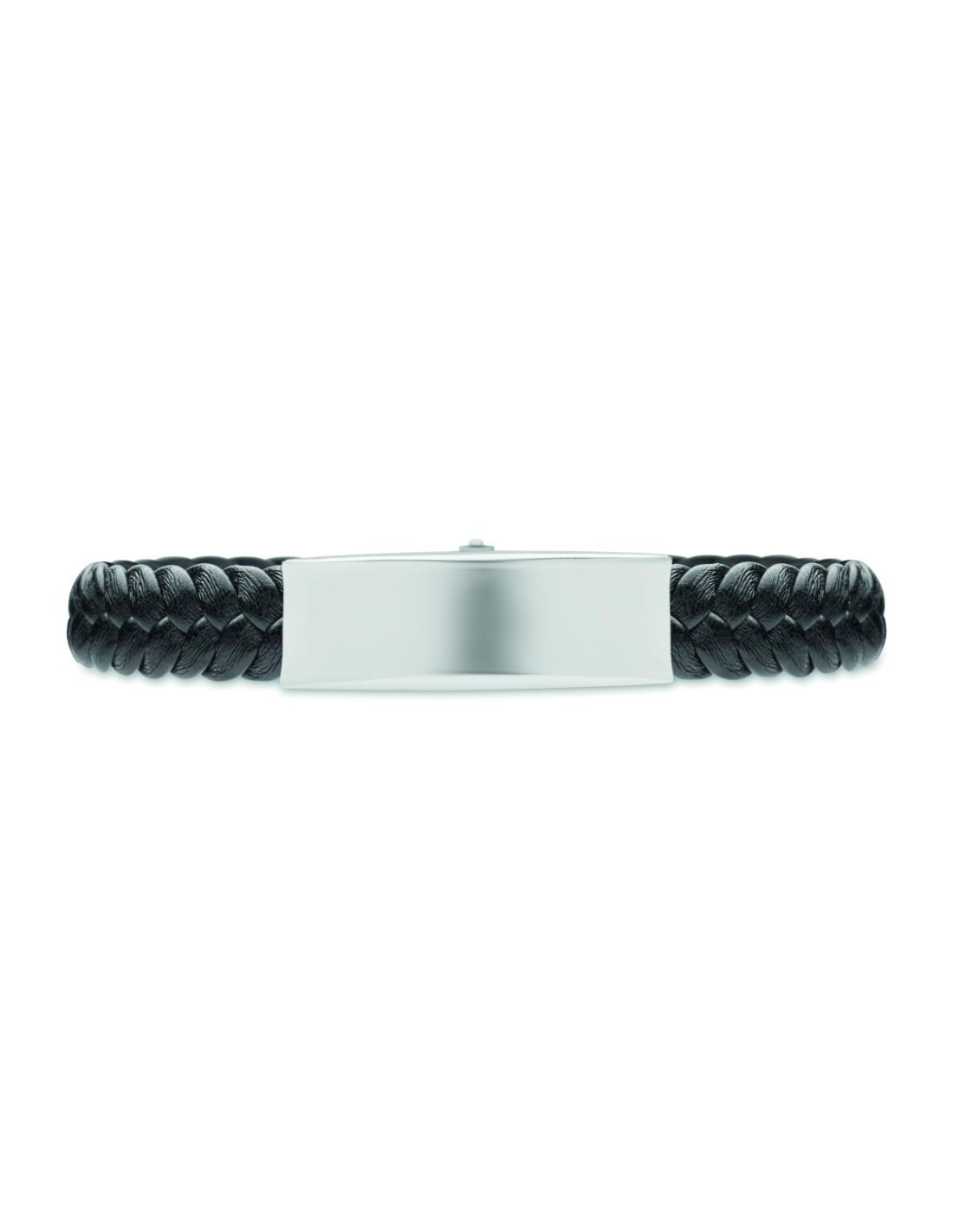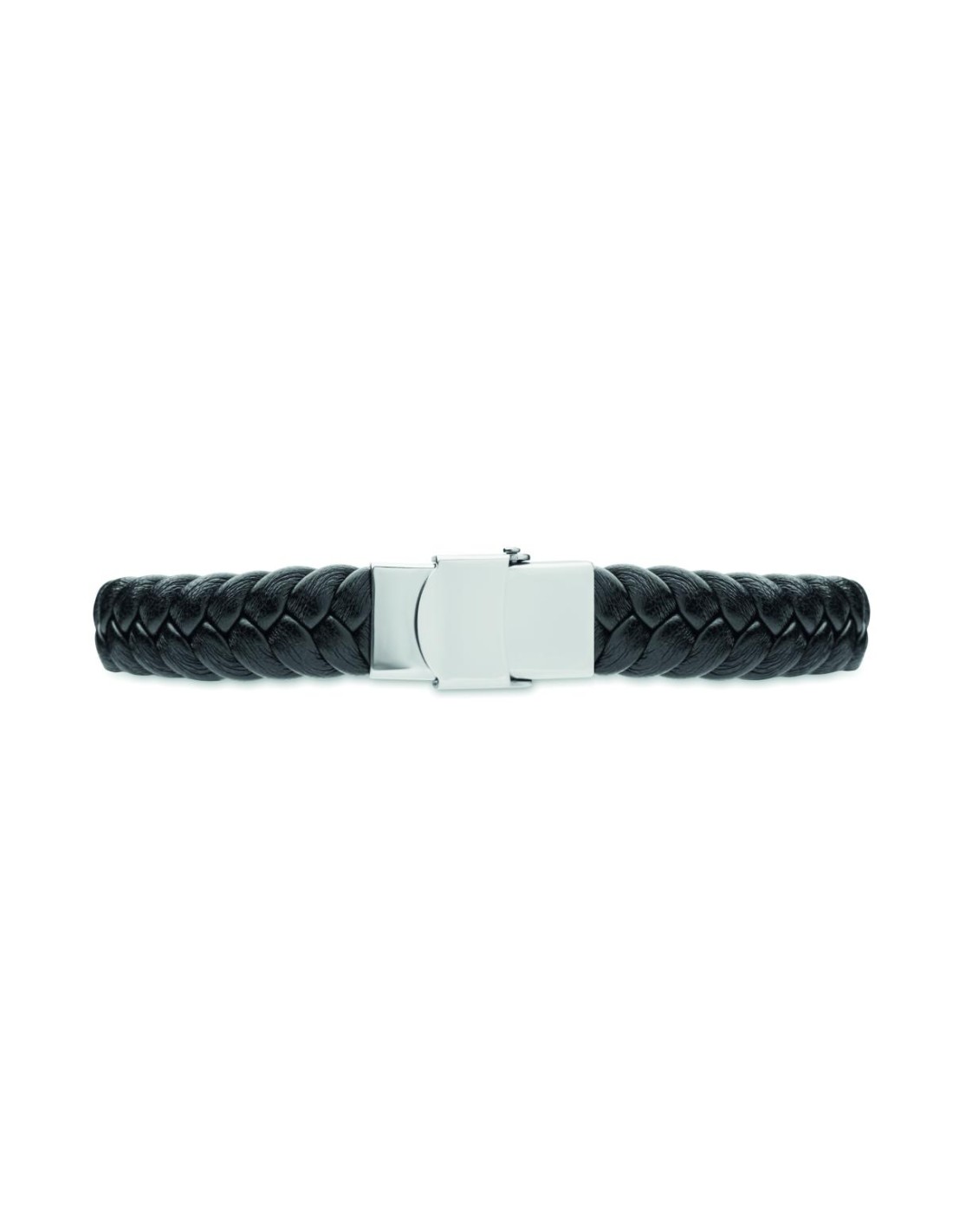 Brazalete trenzado de piel sintética con herrajes de acero pulido. Cierre de presión. Circunferencia de la muñeca: 21 cm.