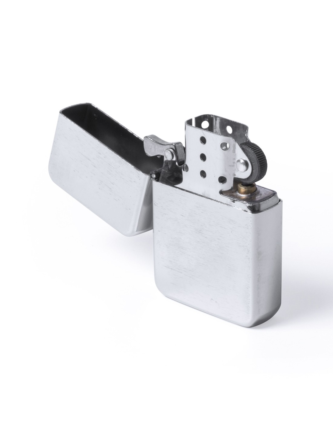 Encendedor de clásico diseño americano, de acabado metálico en mate. A gasolina y de mecanismo de piedra. Con protección infantil, recargable y presentado en caja individual.