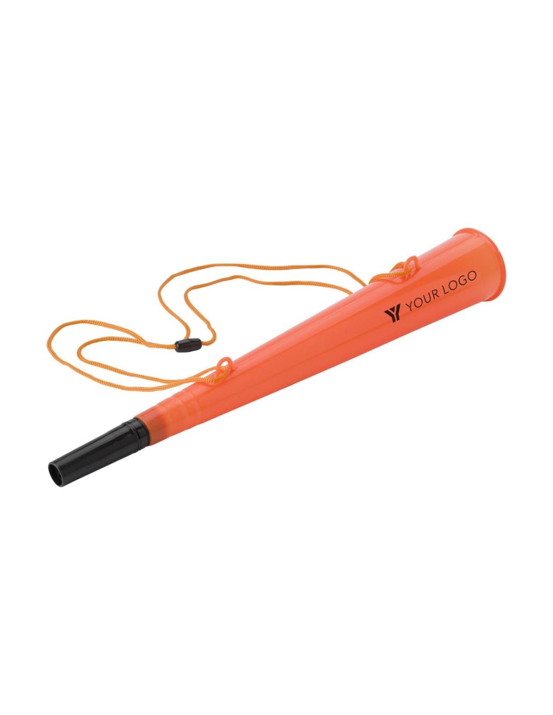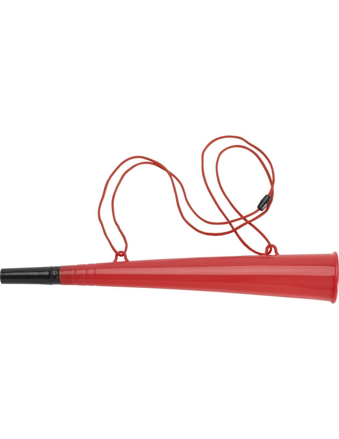 Corneta de PP con cordón (100 cm.) y cierre de seguridad. Ideal para animar fiestas o eventos deportivos.