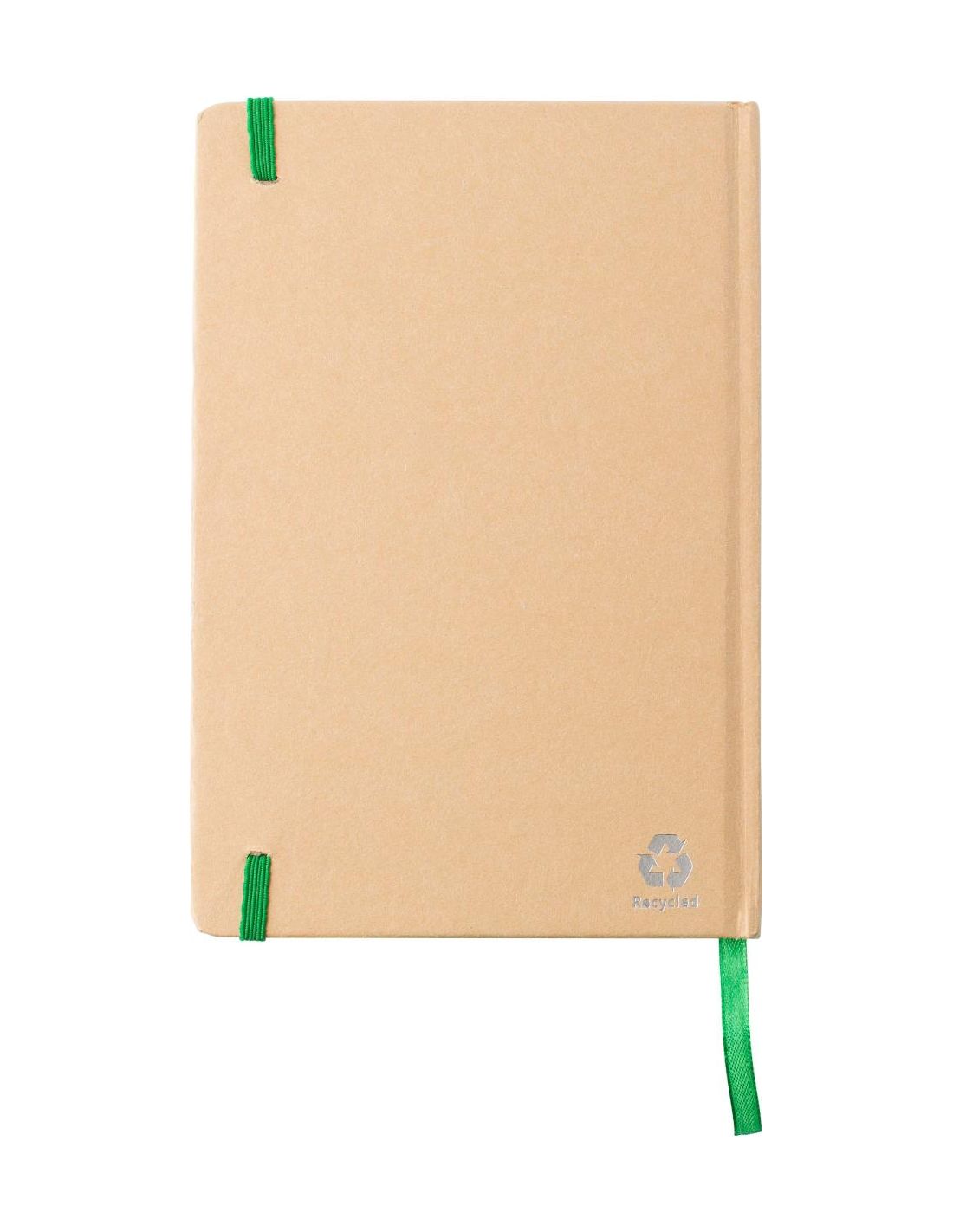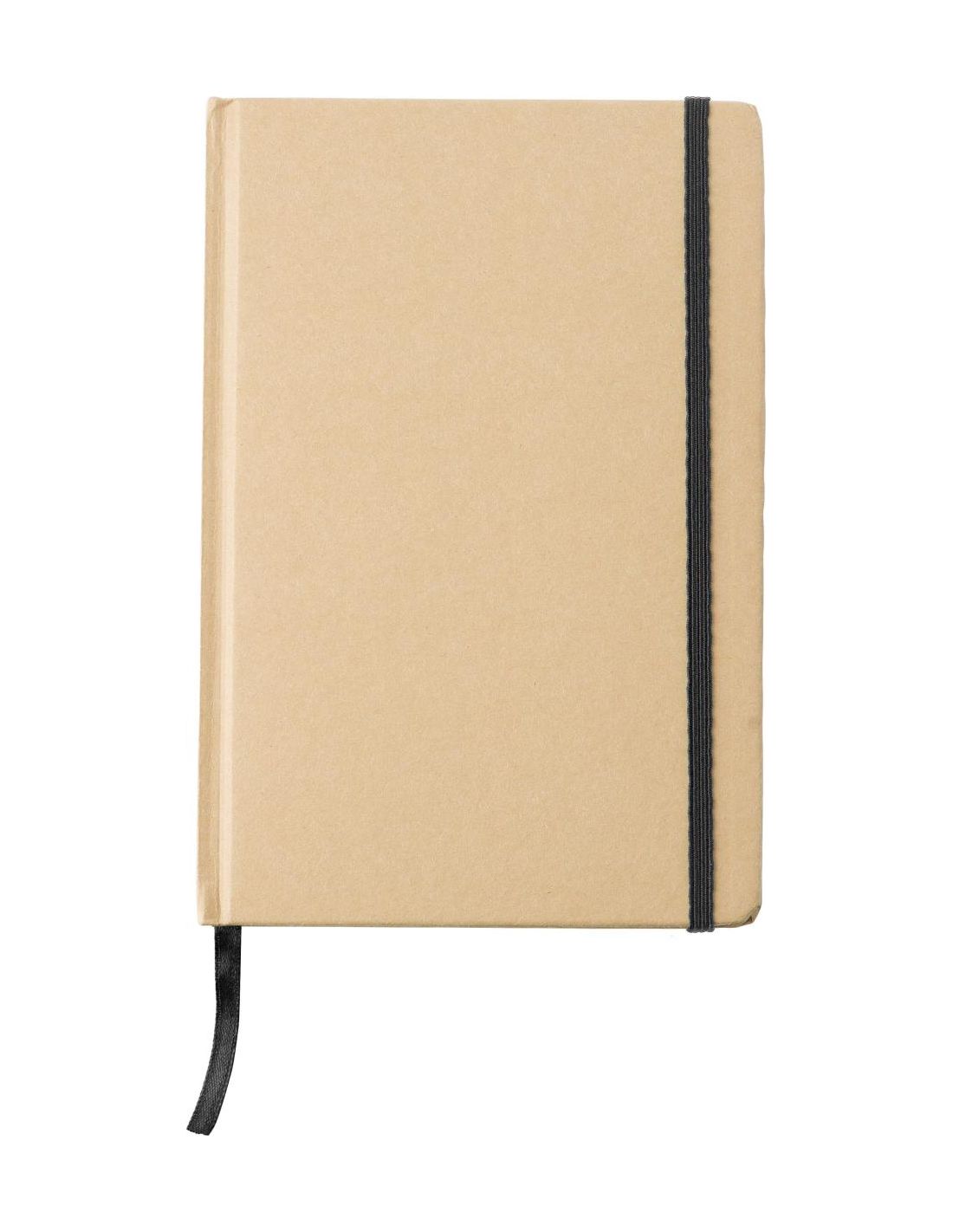 Cuaderno de cartón reciclado (aprox. A5). 160 páginas lineadas, marca páginas y cierre con goma.