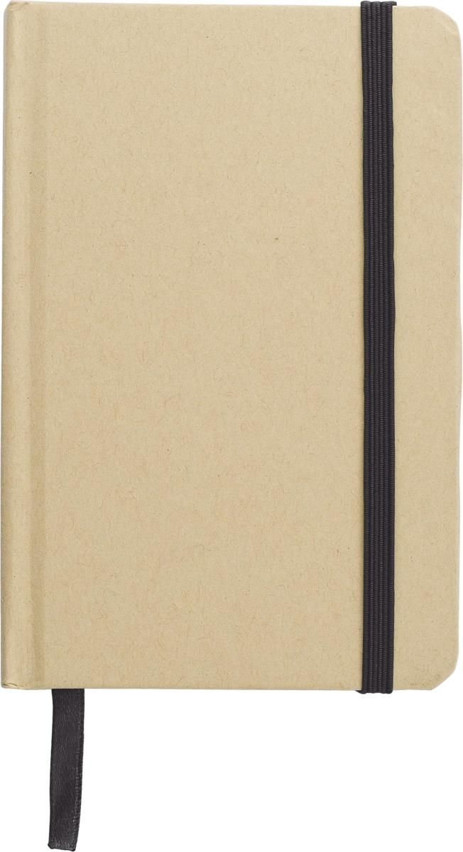 Libreta de cartón reciclado (aprox A6) con 80 hojas lineadas, marca páginas y cierre con goma.