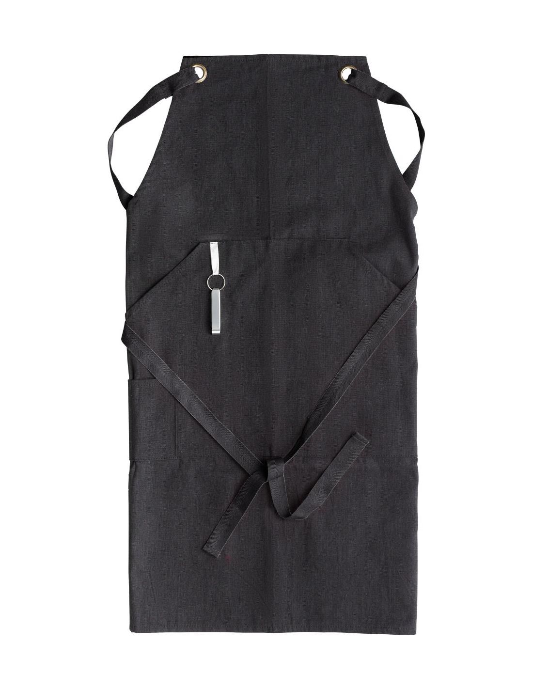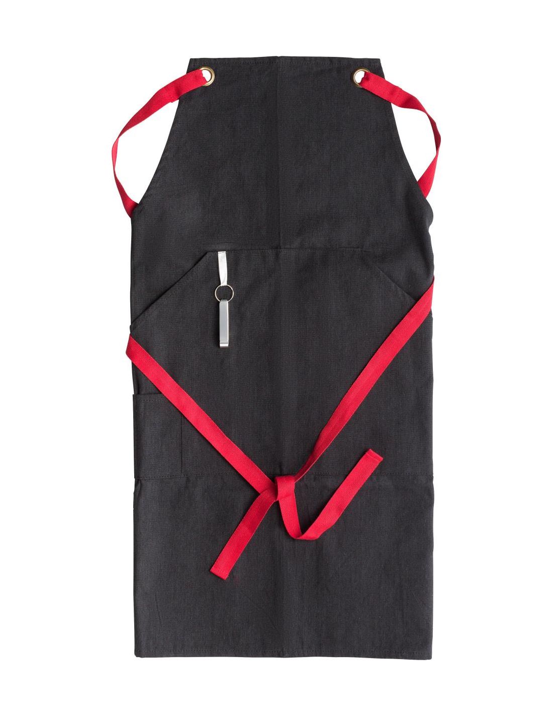 Delantal de algodón y poliéster con cintas coloreadas para atar en varias posiciones. En el bolsillo frontal tiene un abrebotellas.