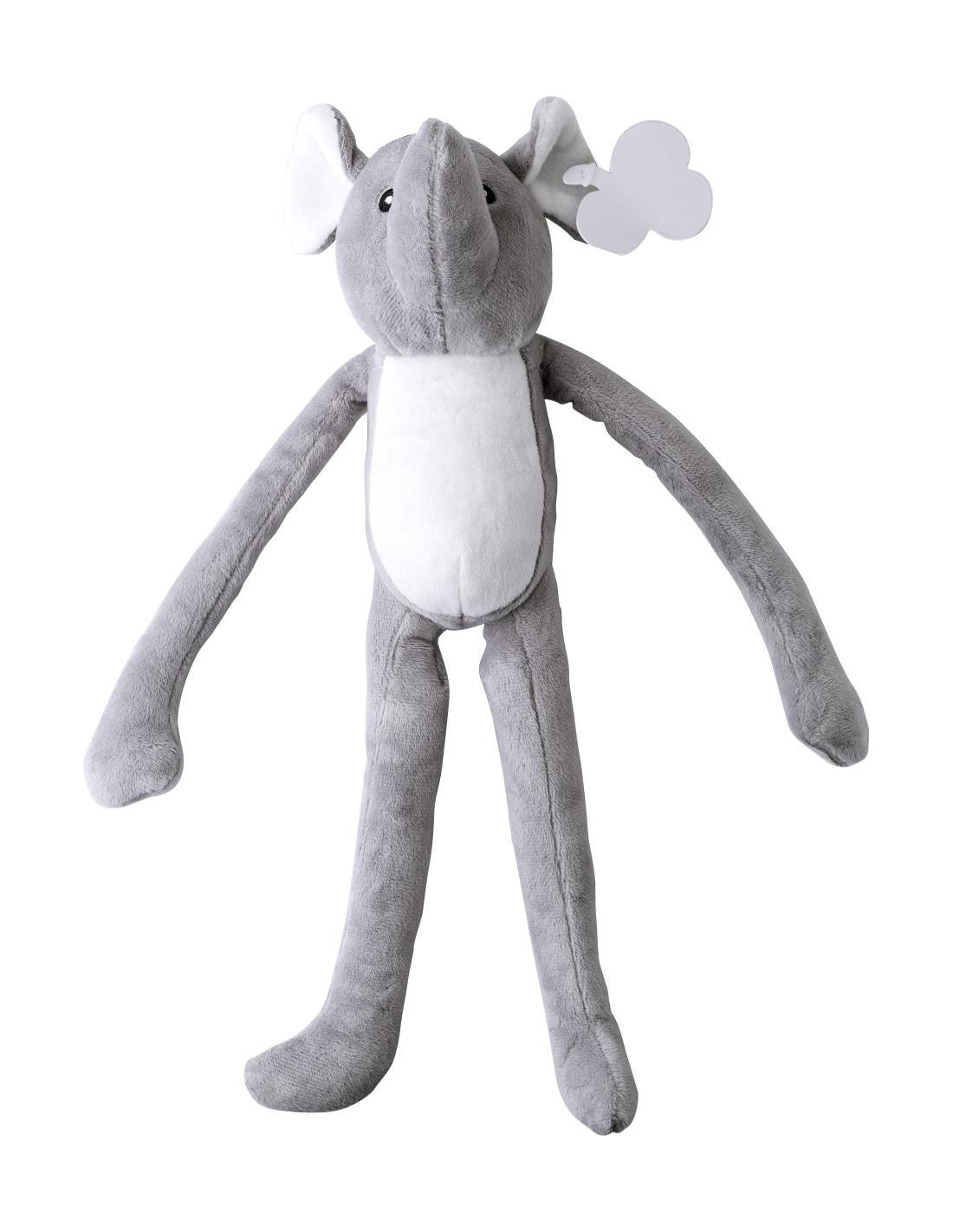 Elefante de peluche con brazos y piernas largos y velcro en las manos. Ojos bordados. Incluye una etiqueta para imprimir.
