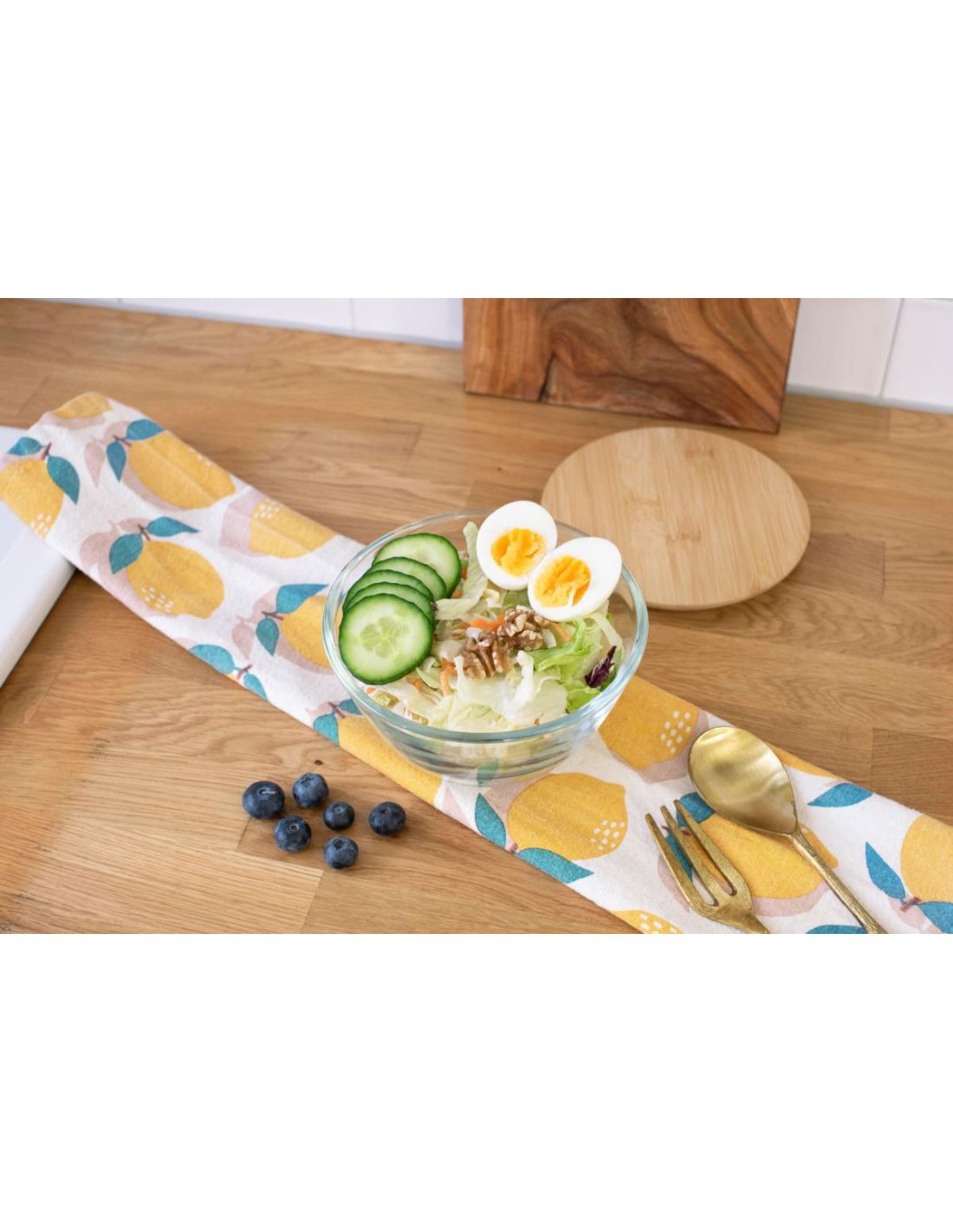 Ensaladera de cristal con tapa de bambú y cierre de silicona. Capacidad 1200 ml. Vidrio especial reforzado (borosilicato), fino pero resistente. Presentada en una caja de cartón marrón.