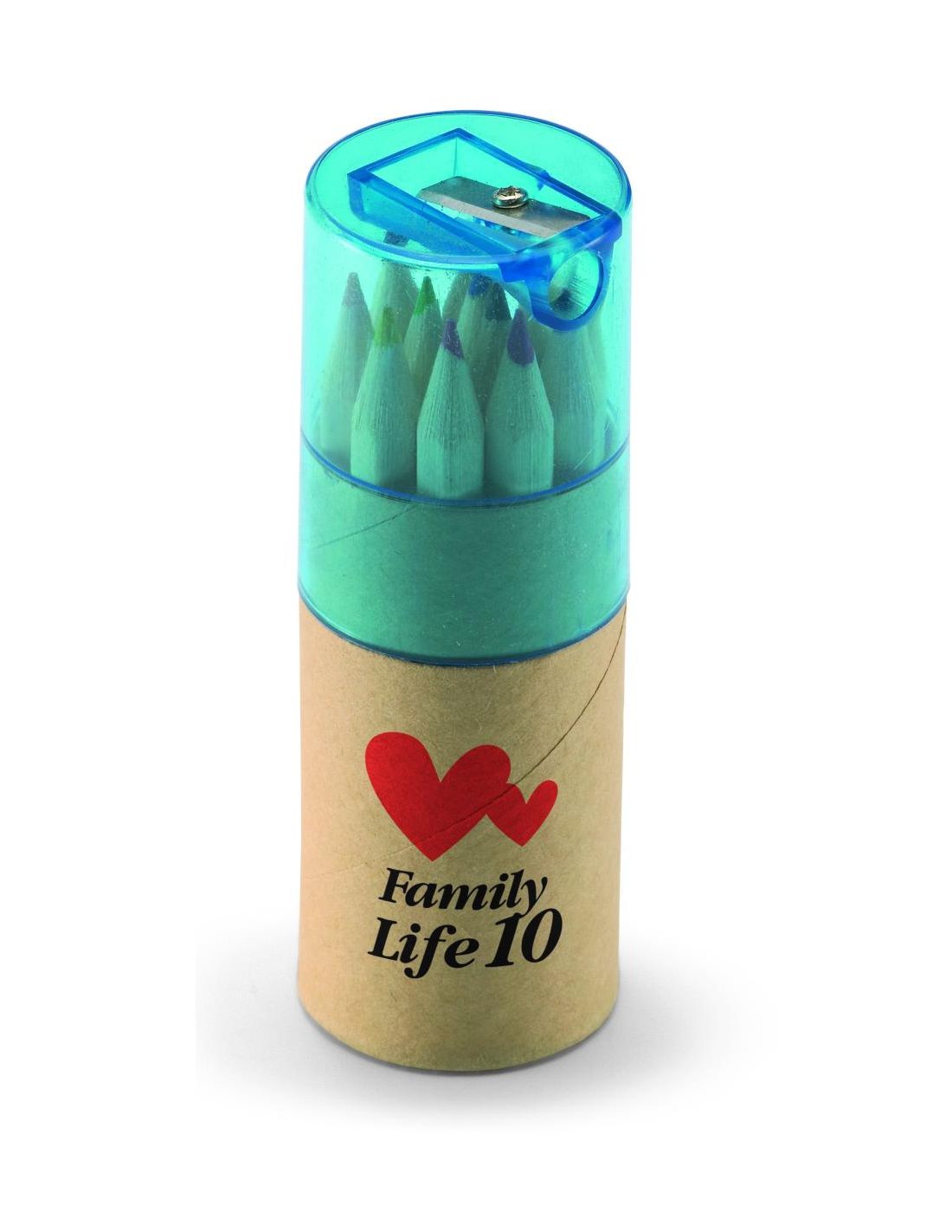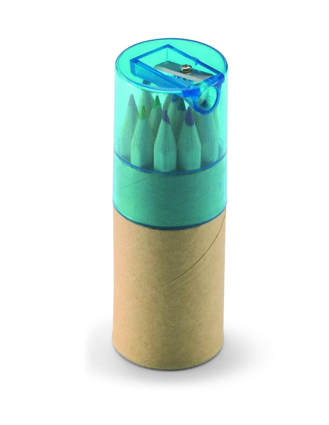 12 lápices de colores en tubo de cartón reciclado. Tapa transparente con sacapuntas.