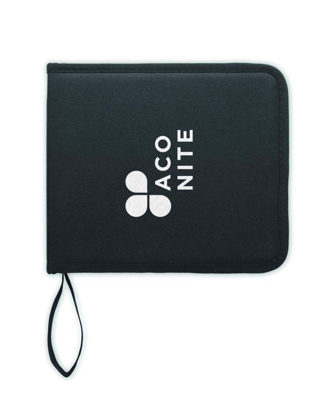 Set profesional de dibujo de 40 piezas. Incluye: 14 lápices, 12 rotuladores de colores, 1 papel de lija, varios rotuladores de carboncillo, 1 lápiz de grafito sin madera, 1 extensor de lápices, 1 sacapuntas, 1 goma de borrar, 1 pincel y 1 cuchillo de manualidades. Presentado en un resistente estuche con cremallera de poliéster RPET 450D.