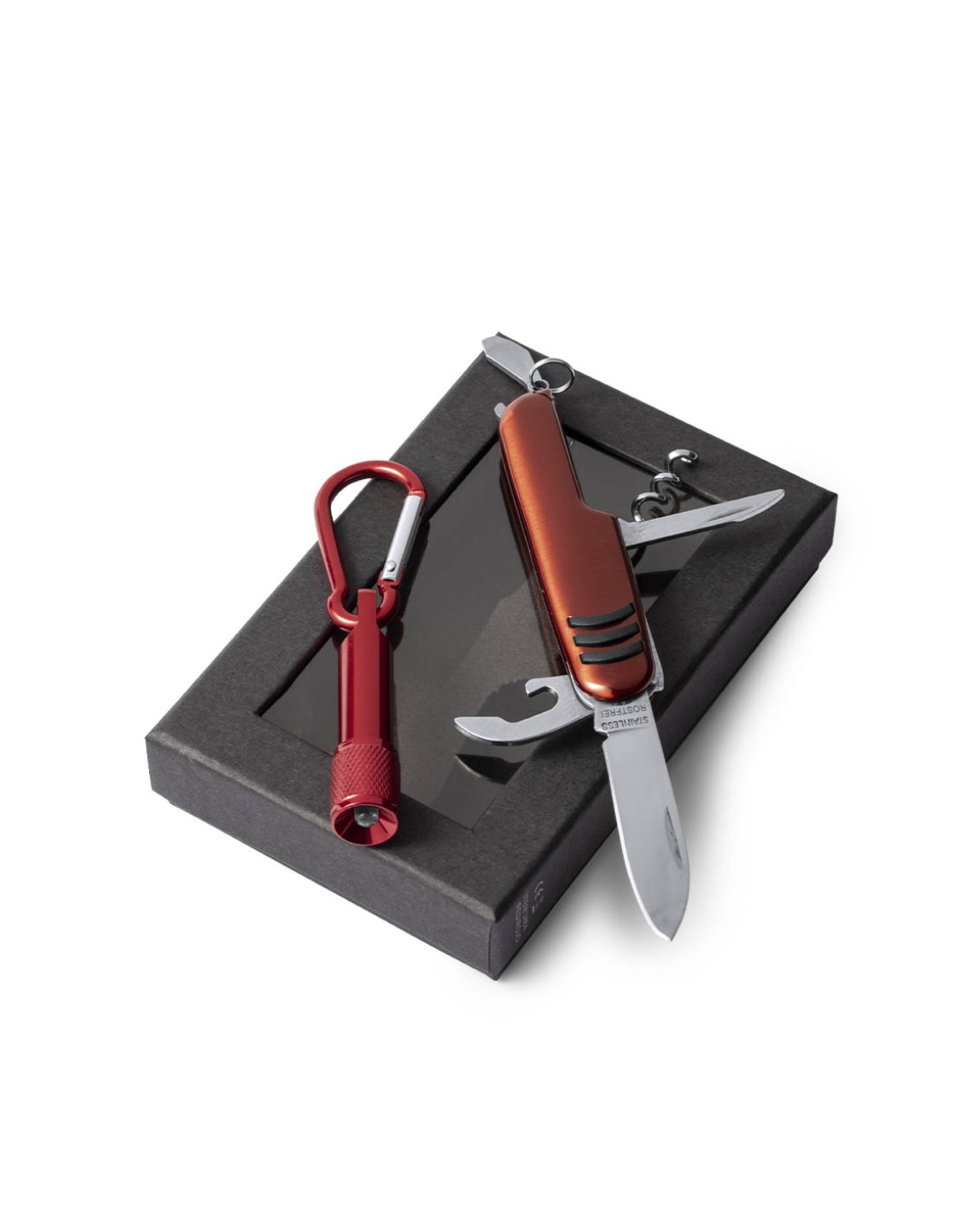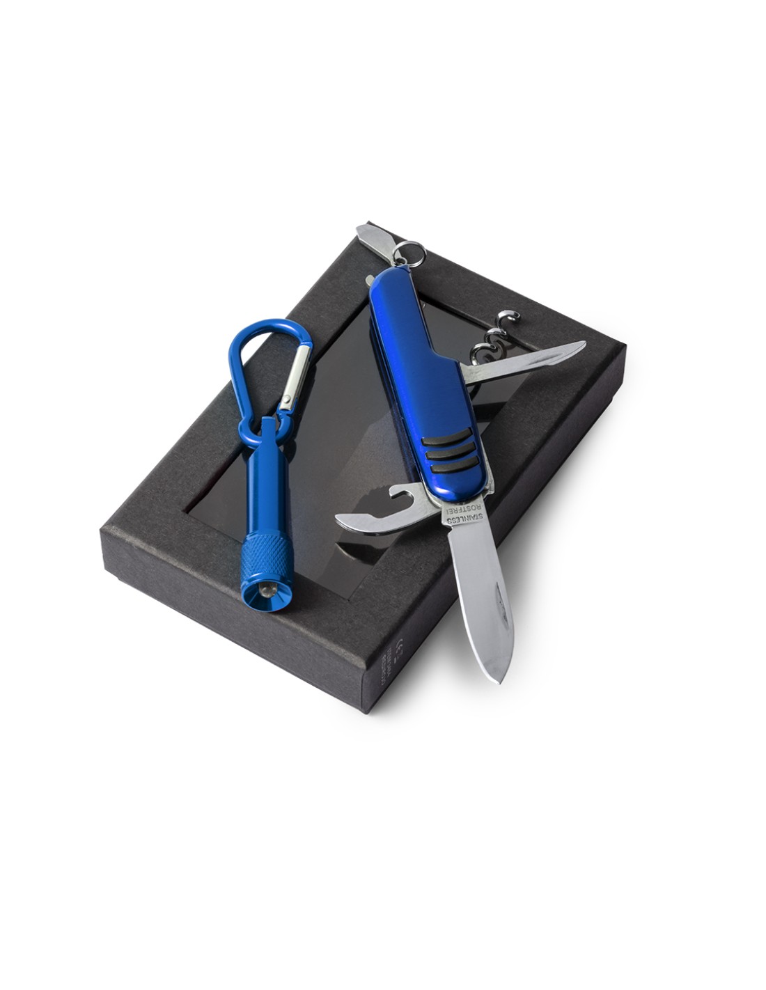 Set de aluminio de navaja multiusos con 7 funciones y linterna mosquetón. En variados colores y presentado en estuche individual con ventana y suave espuma interior troquelada. Pilas de botón incluidas.