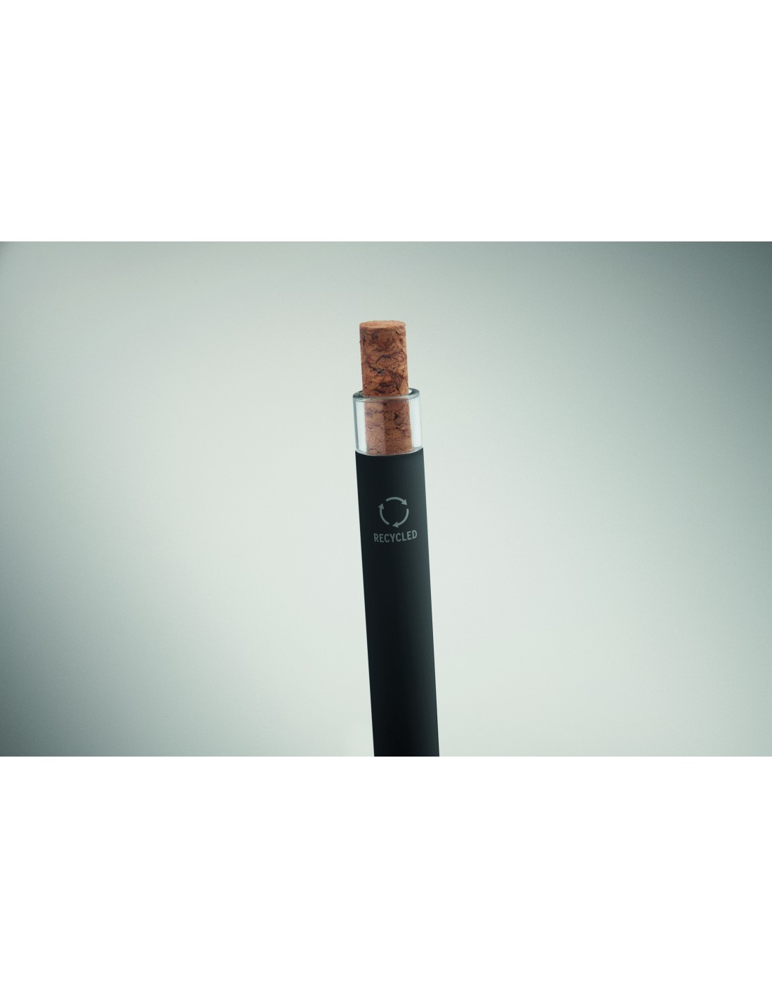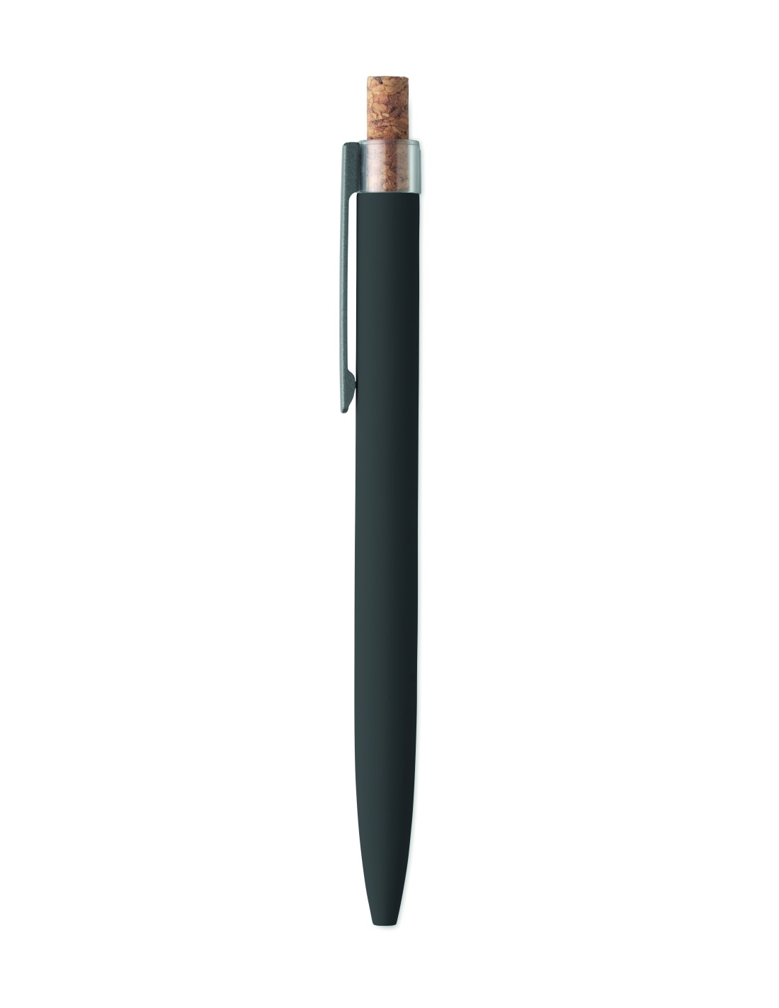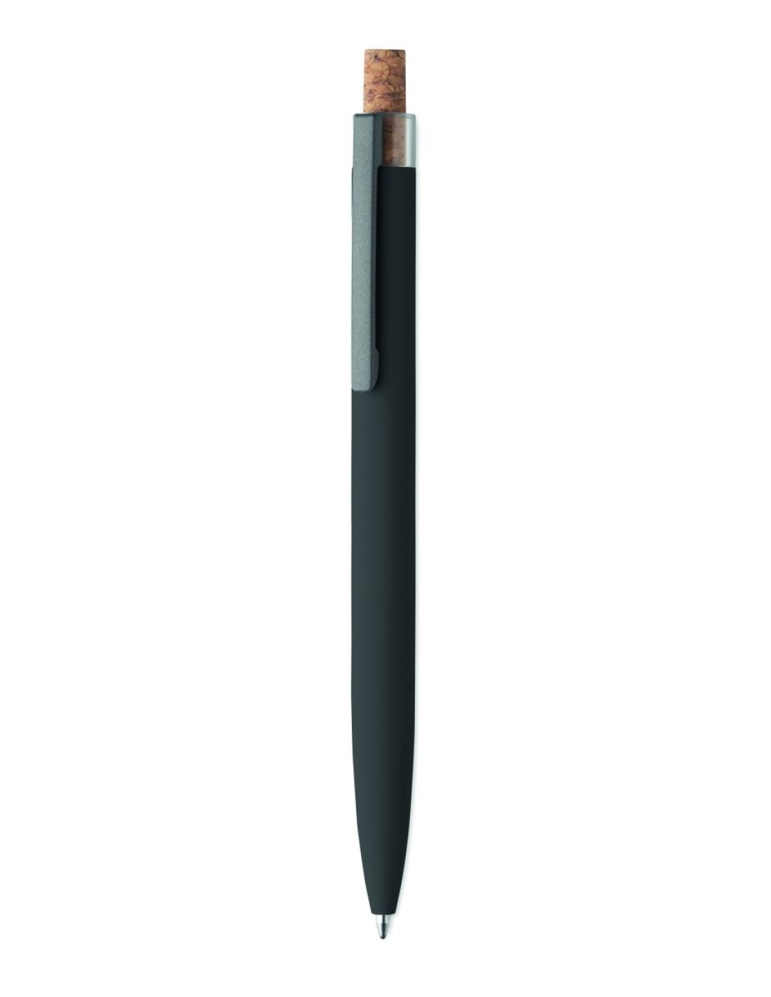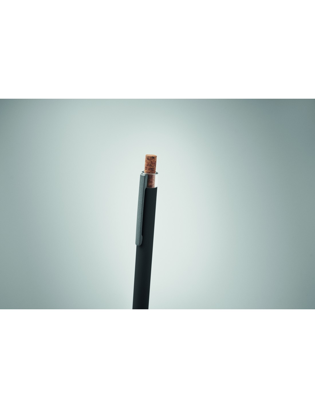 Bolígrafo de aluminio reciclado con pulsador de corcho y clip metálico. Tinta azul.