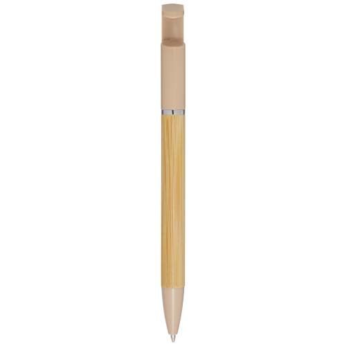 Bolígrafo de bambú que también funciona como soporte para el teléfono. El botón y el anillo central están hechos de plástico reciclado, la punta es de latón y el cuerpo de bambú de origen responsable. Color de la tinta: Negro. Longitud de escritura: 1000 metros. Tamaño del plumín: 1,0 mm.