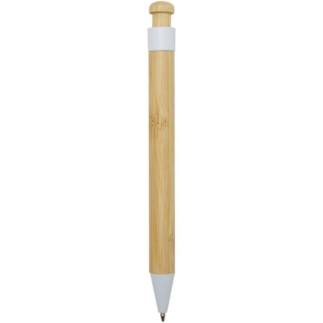 Bolígrafo con clip y punta de plástico reciclado, con el botón y el cuerpo de bambú. Color de la tinta: Negro. Longitud de escritura: 1000 metros. Tamaño del plumín: 1,0 mm.