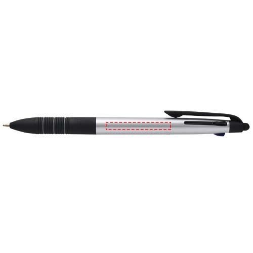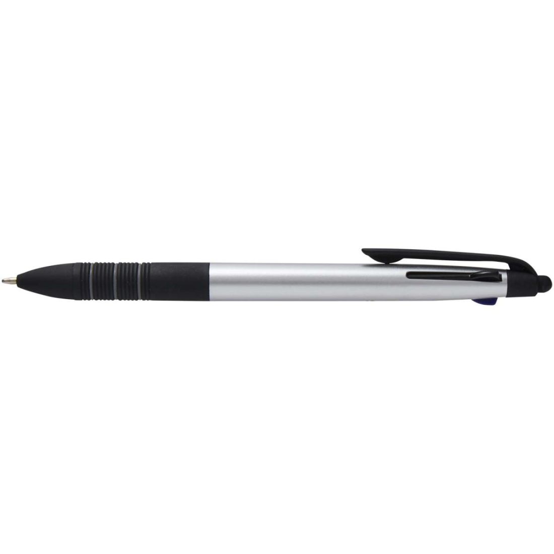 El bolígrafo 3 en 1 es un instrumento de escritura versátil fabricado en plástico ABS con certificado RCS. Tiene un moderno acabado metálico y una punta stylus integrada para usar en pantallas táctiles. Dispone de un mecanismo deslizante para cambiar fácilmente entre tinta negra, azul y roja. La empuñadura ergonómica con caucho negro antideslizante y detalles de anillas grises garantiza un manejo cómodo. Compacto, funcional e ideal para tu marca, el bolígrafo es perfecto para tomar notas, presentaciones o interacciones digitales.