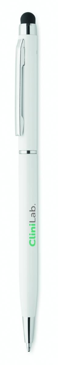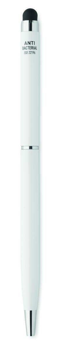 Bolígrafo giratorio en aluminio con tratatamiento antibacteriano ISO 22196 y clip en color cromado brillante y puntero para pantallas táctiles. Tinta azul.