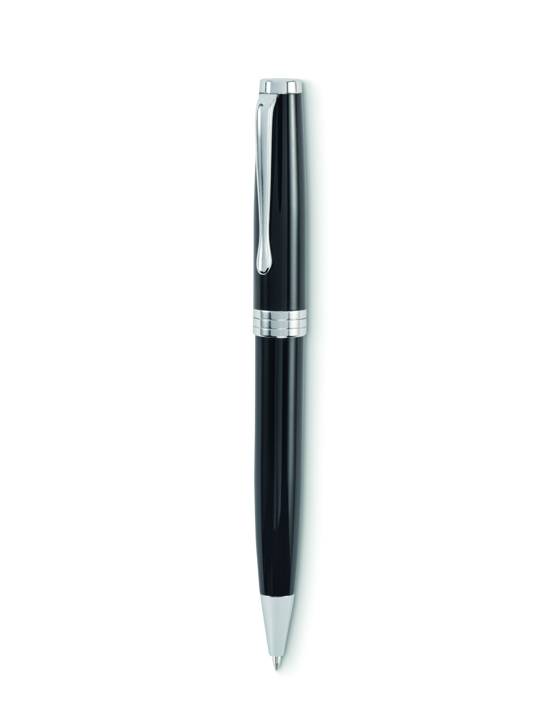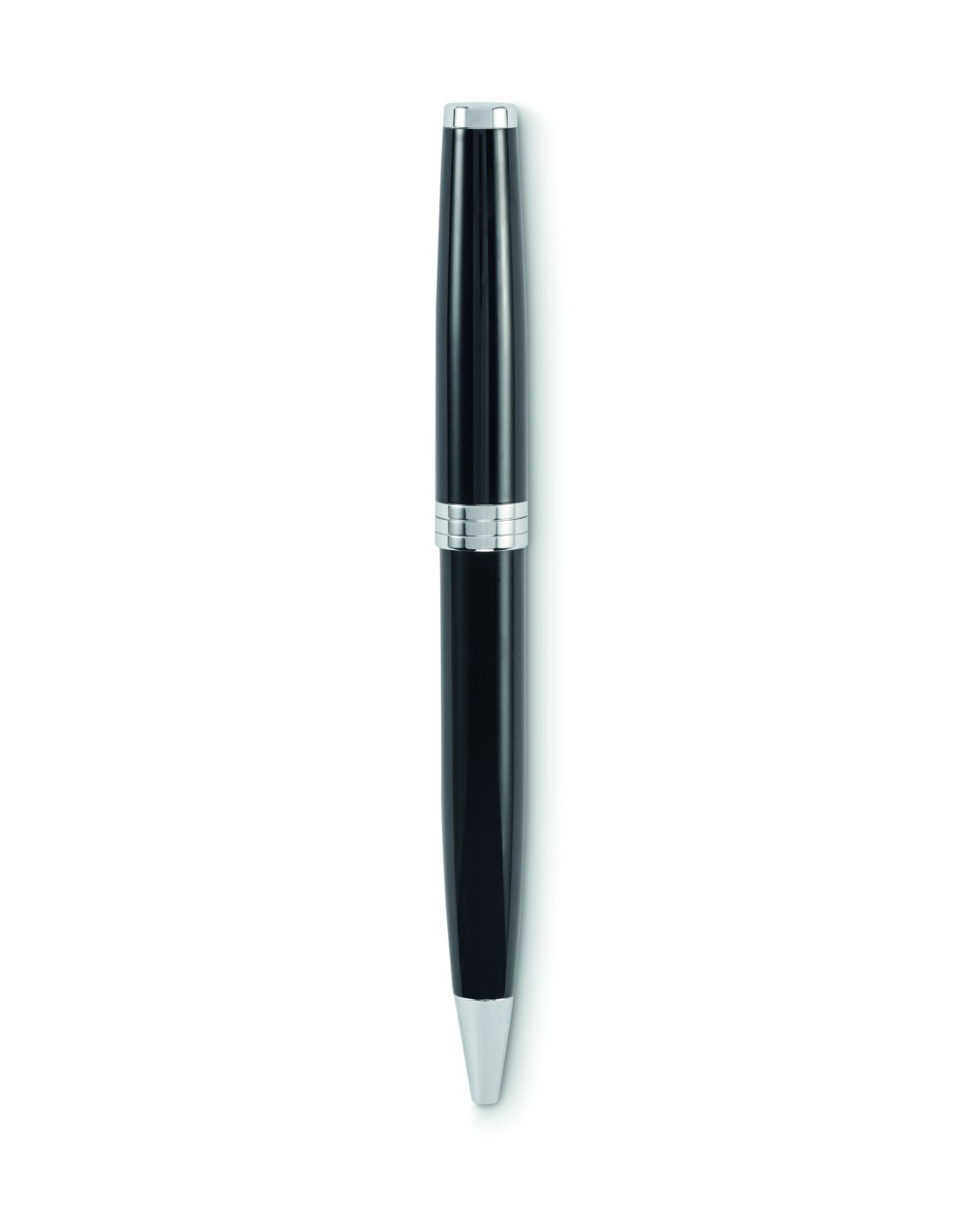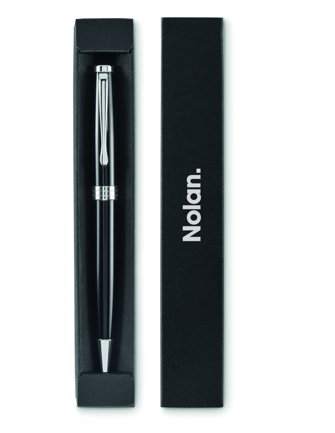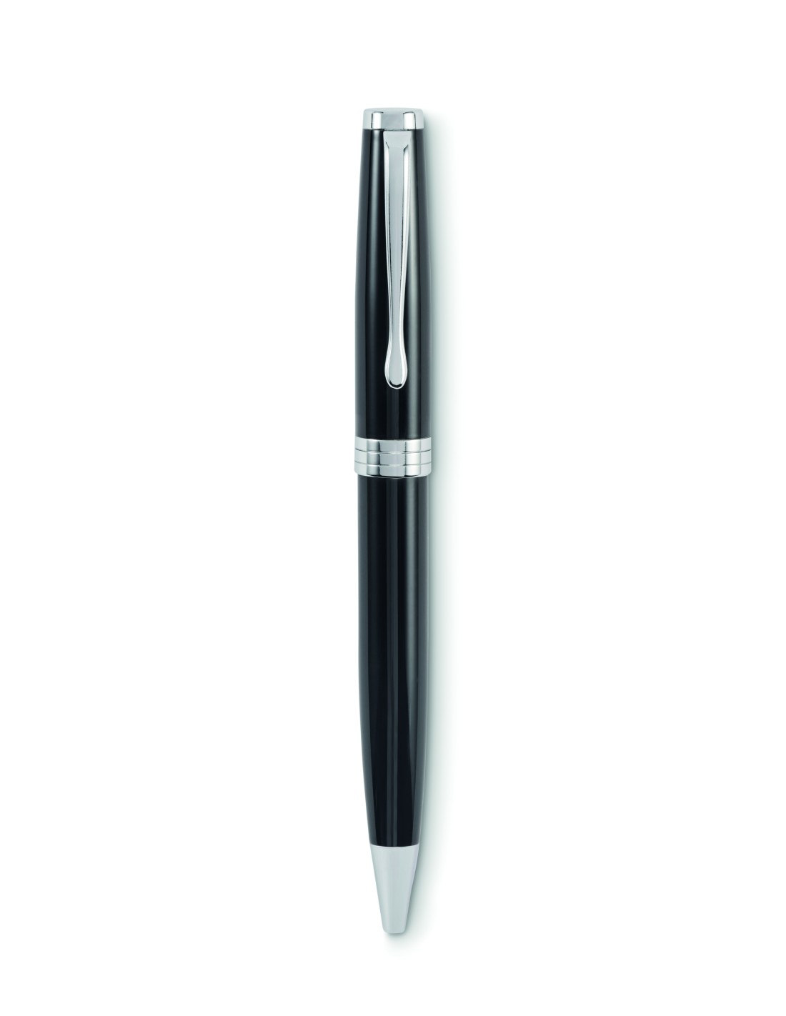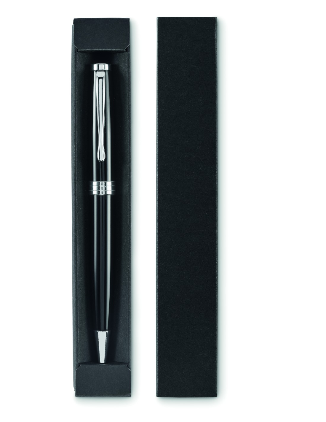 Bolígrafo con cuerpo de acero inoxidable reciclado. Tinta azul. Presentado en estuche.