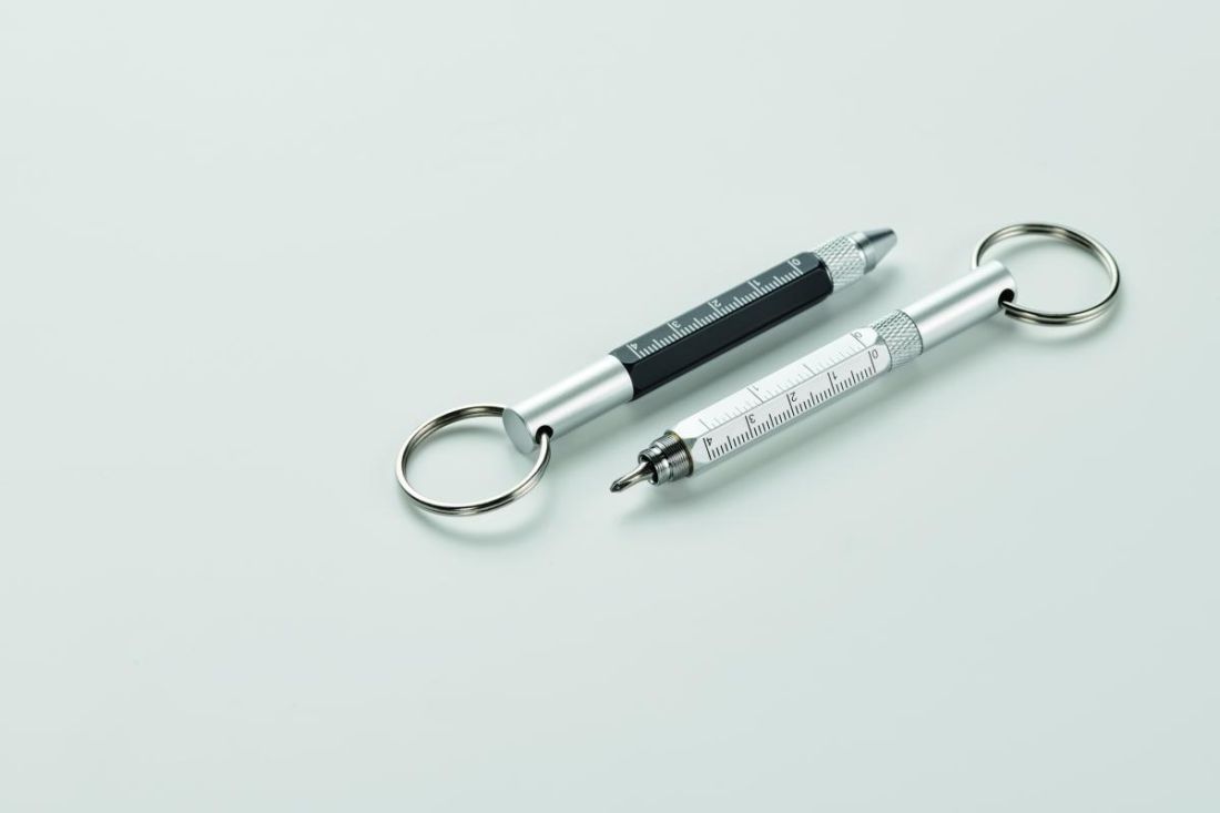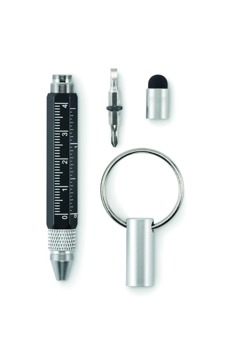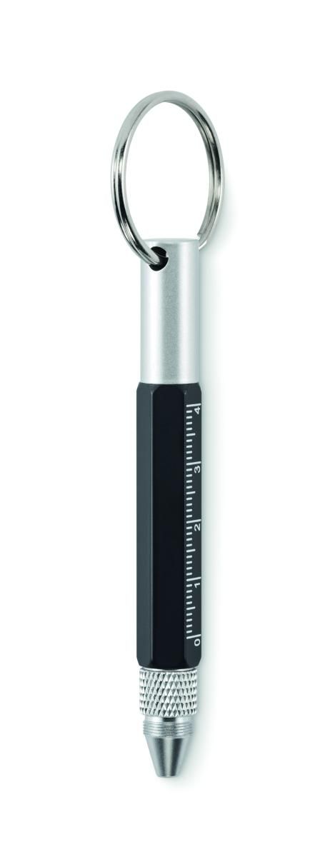 Llavero herramienta con bolígrafo giratorio de aluminio reciclado con regla de 4 cm y 1,5 pulgadas, lápiz óptico y destornillador 2 en 1 de cabeza plana y Phillips. Tinta negra.