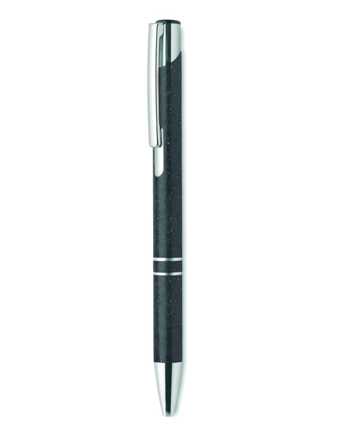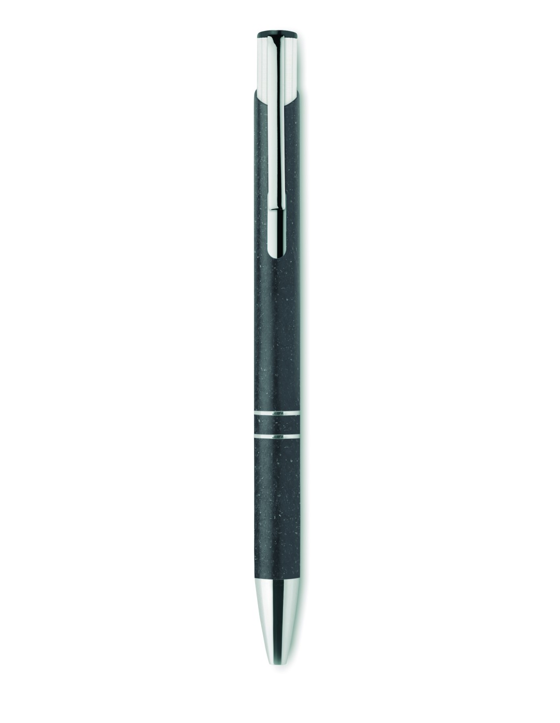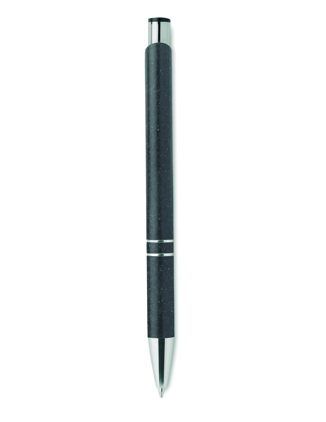 Boligrafo pulsador de paja de trigo (50%) y de ABS (50%) con acabados plateados. Tinta azul.