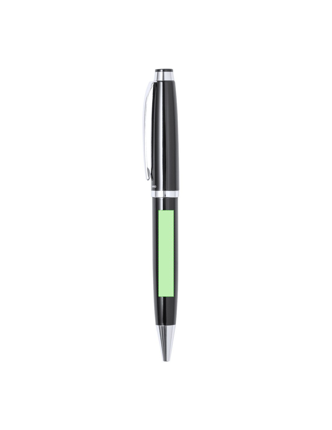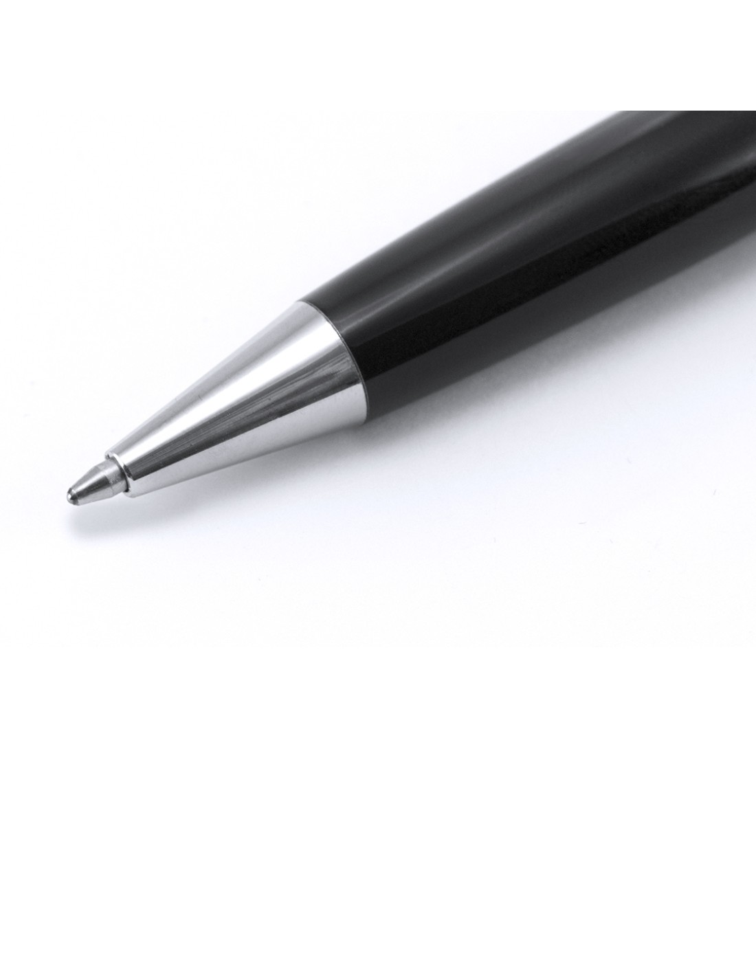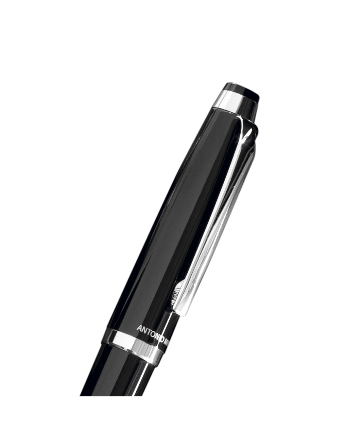 Bolígrafo de Antonio Miró en elegante diseño bicolor y suave cuerpo metálico en sobrio color negro. Con logotipo de la marca encima de la anilla, clip y punta en acabado plateado brillante. Presentado en estuche individual en color negro con logotipo de la marca. De cartucho jumbo con tinta azul.