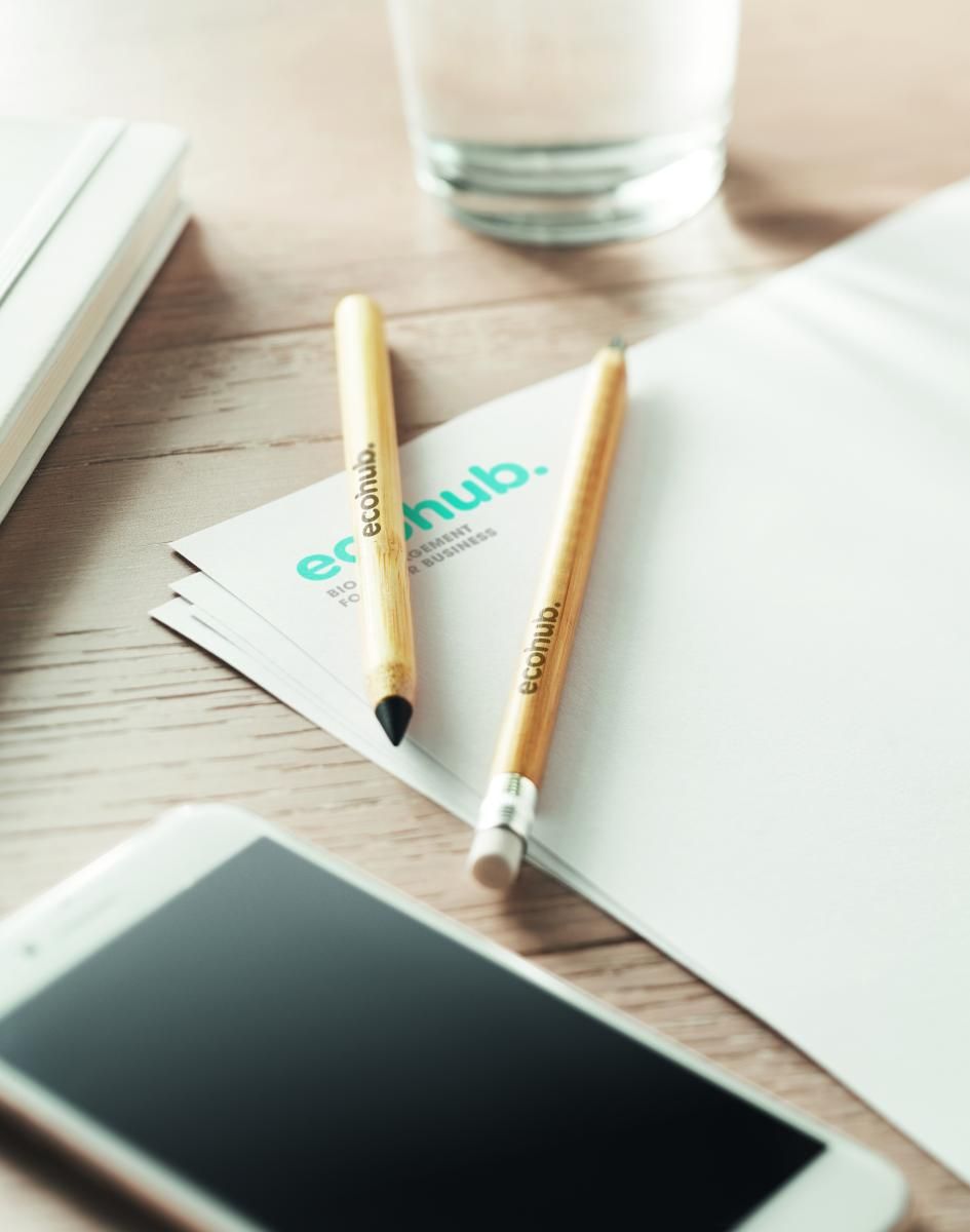 Bolígrafo de bambú sin tinta y de larga duración. Este bolígrafo escribe con punta de grafito, por lo que tiene una vida útil más larga.