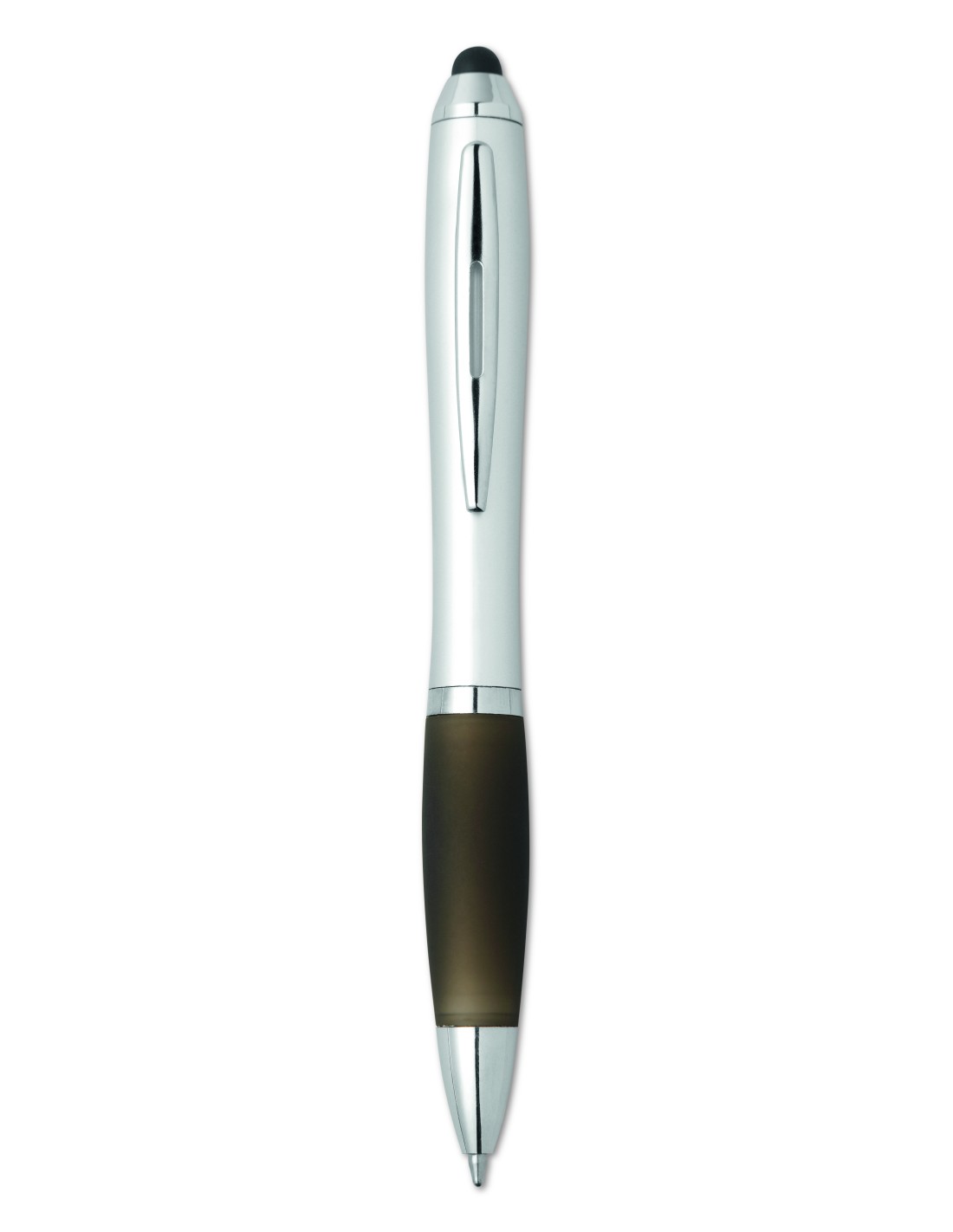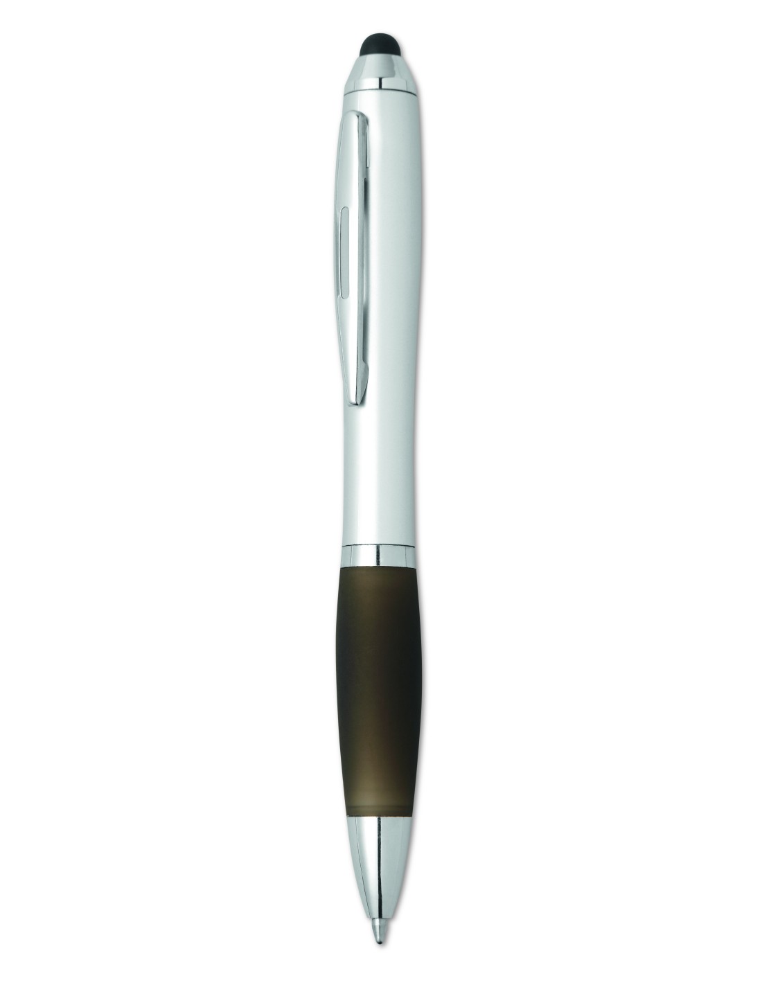 Bolígrafo giratorio de plástico con agarre suave y con puntero para pantallas táctiles. Tinta azul.