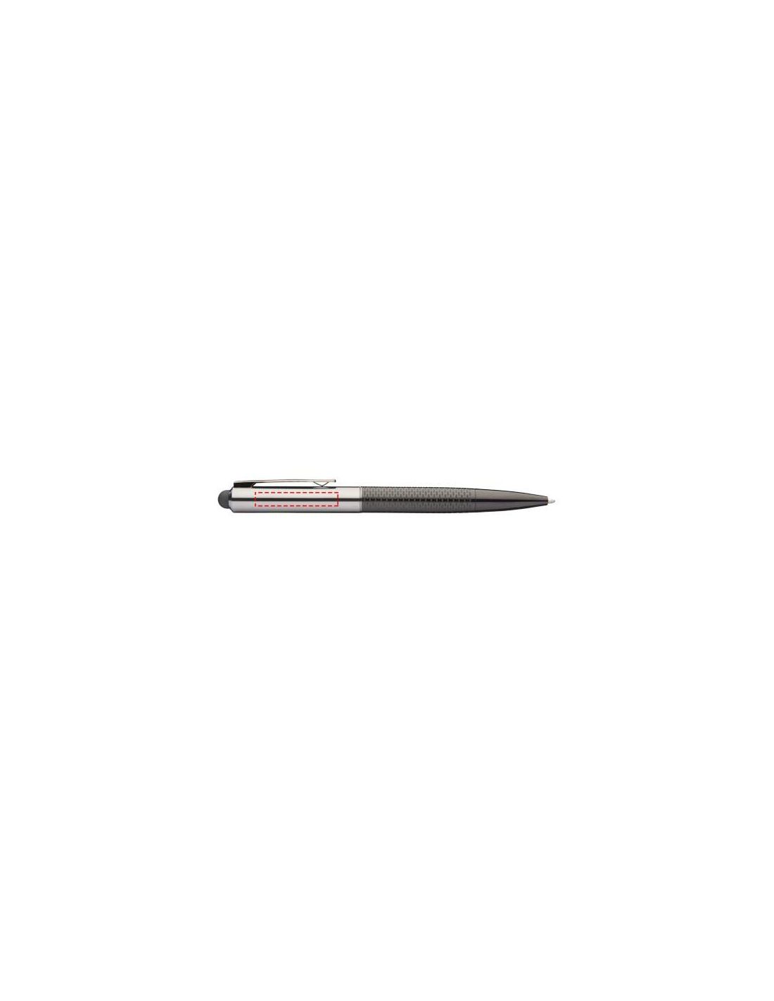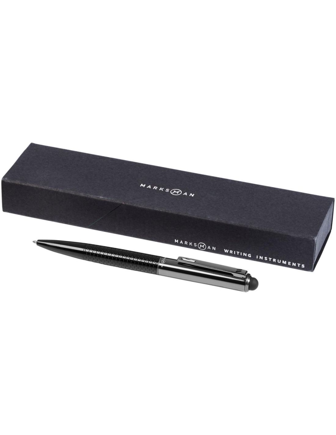Bolígrafo stylus de diseño exclusivo, con elegante cuerpo inferior estampado. Incluye recarga de tinta negra de primera calidad y está empaquetado en una caja de regalo Marksman.