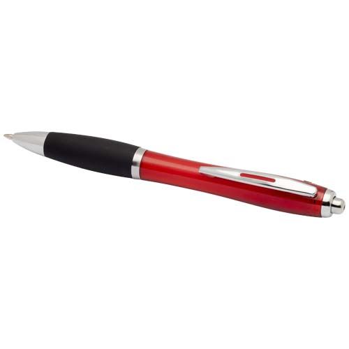 El bolígrafo de plástico reciclado con mecanismo de clic presenta un elegante diseño curvado con cuerpo de color transparente, adornos plateados y empuñadura negra de tacto suave para una escritura...