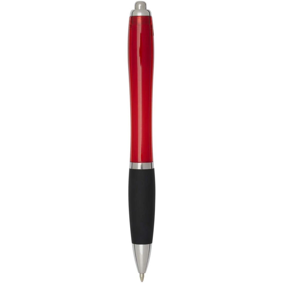 El bolígrafo de plástico reciclado con mecanismo de clic presenta un elegante diseño curvado con cuerpo de color transparente, adornos plateados y empuñadura negra de tacto suave para una escritura...