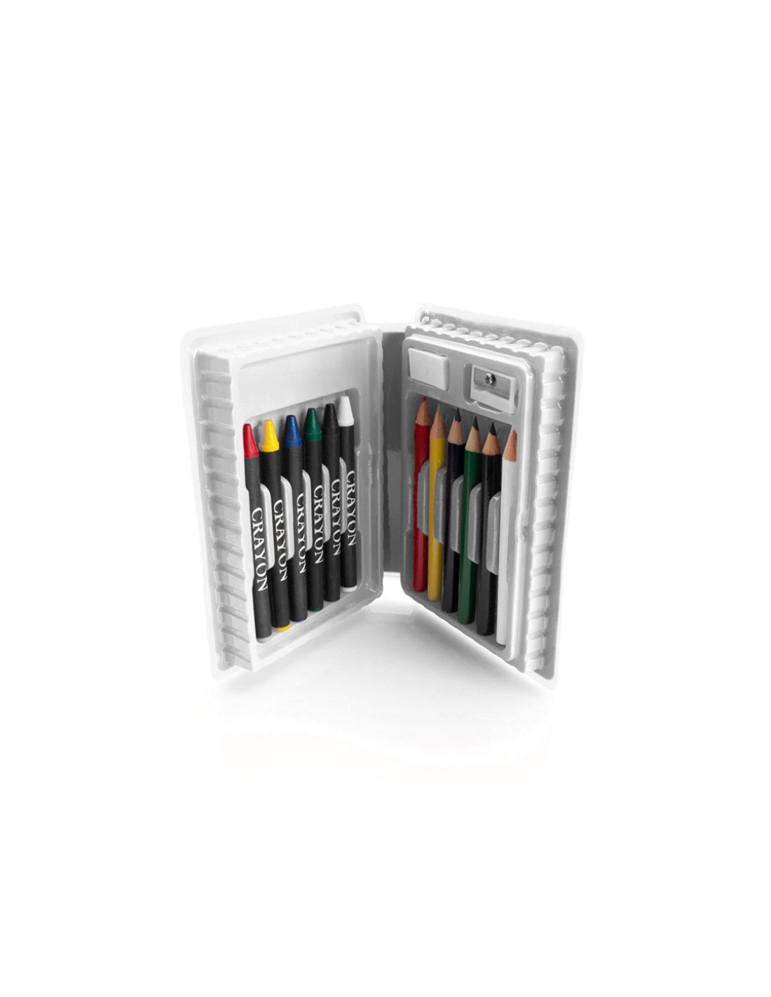 Set de 14 piezas en estuche con resistente cuerpo acabado en brillantes colores e interior con compartimentos de seguridad. Contiene goma, sacapuntas, ceras y lápices de madera de cuerpo cilíndrico en variados colores.