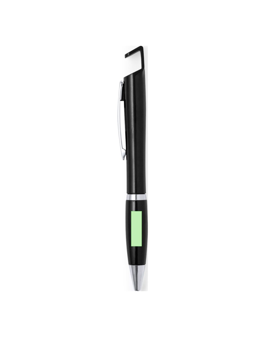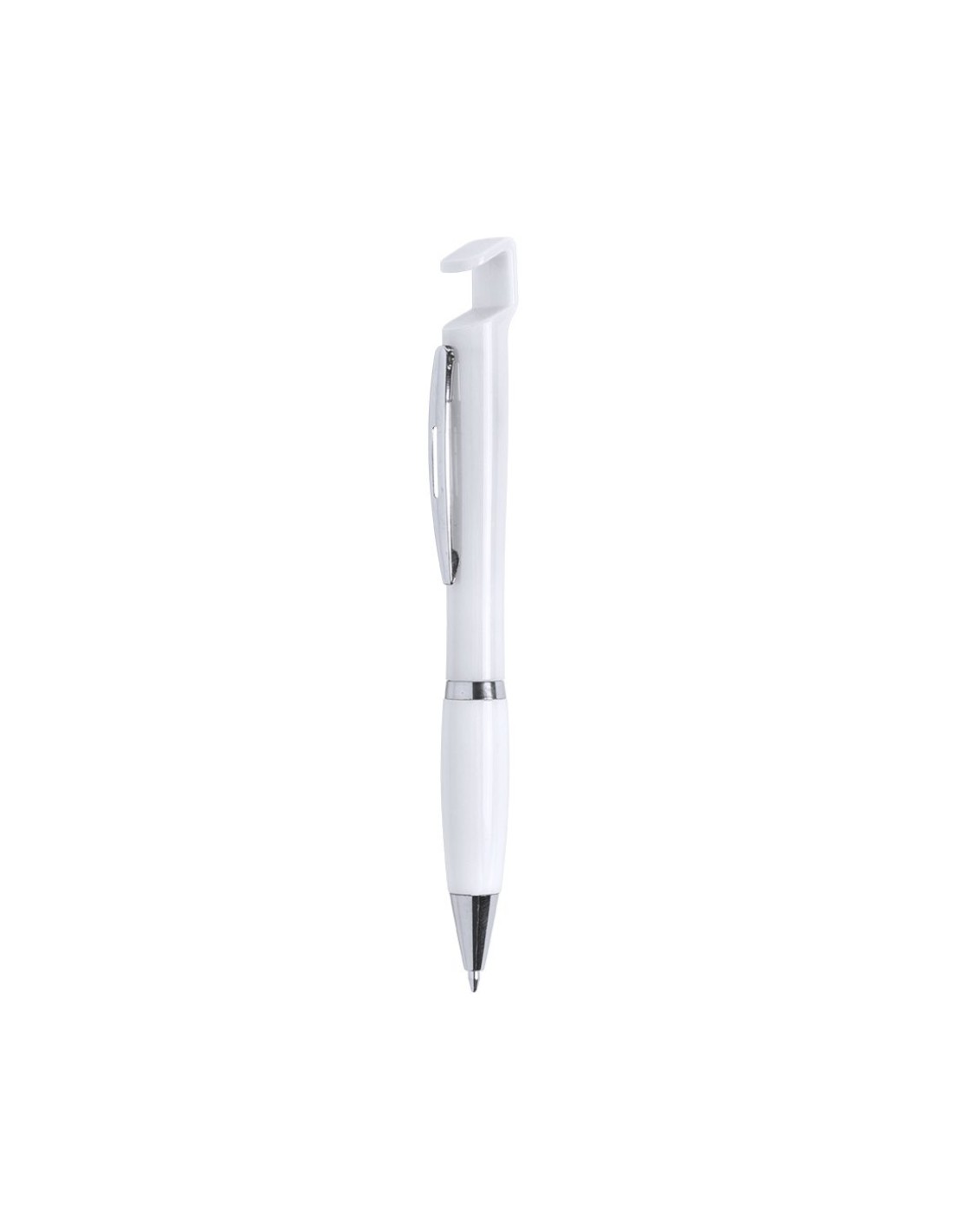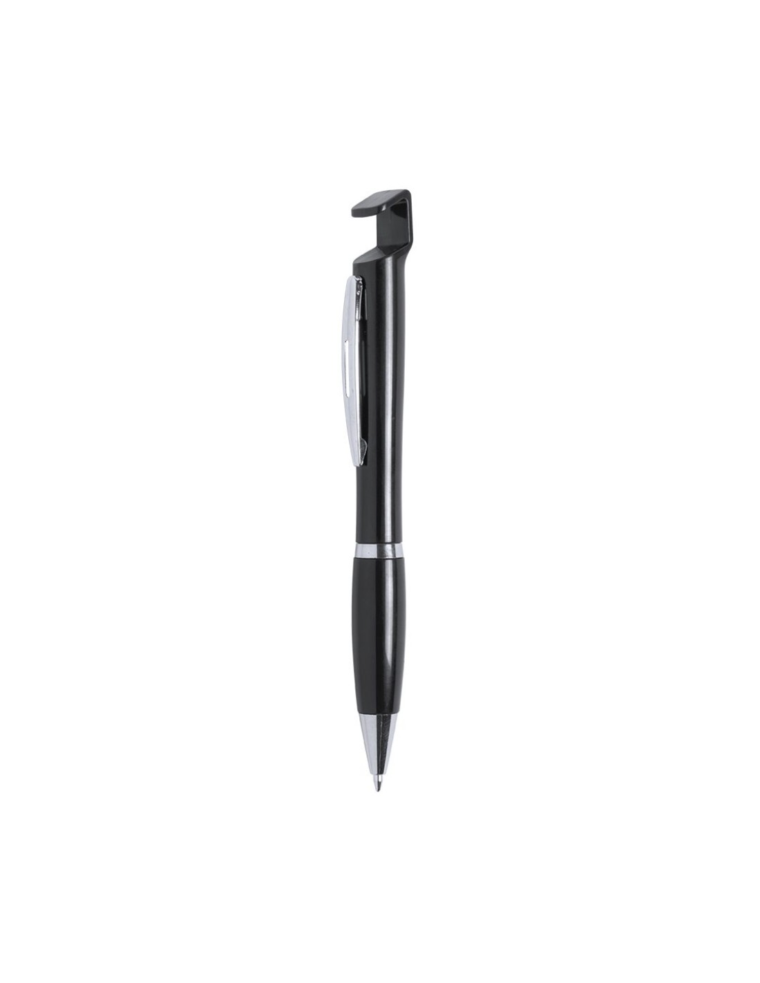 Bolígrafo con soporte para dispositivo móvil. De mecanismo pulsador y atrevido diseño bicolor con accesorios en color plateado y cuerpo de suave acabado en divertidos colores sólidos. Con original clip metálico troquelado a juego y cómoda empuñadura. Tinta azul.