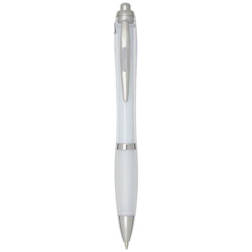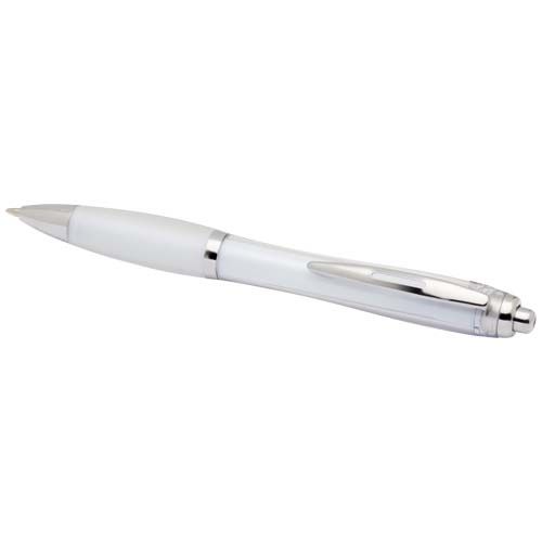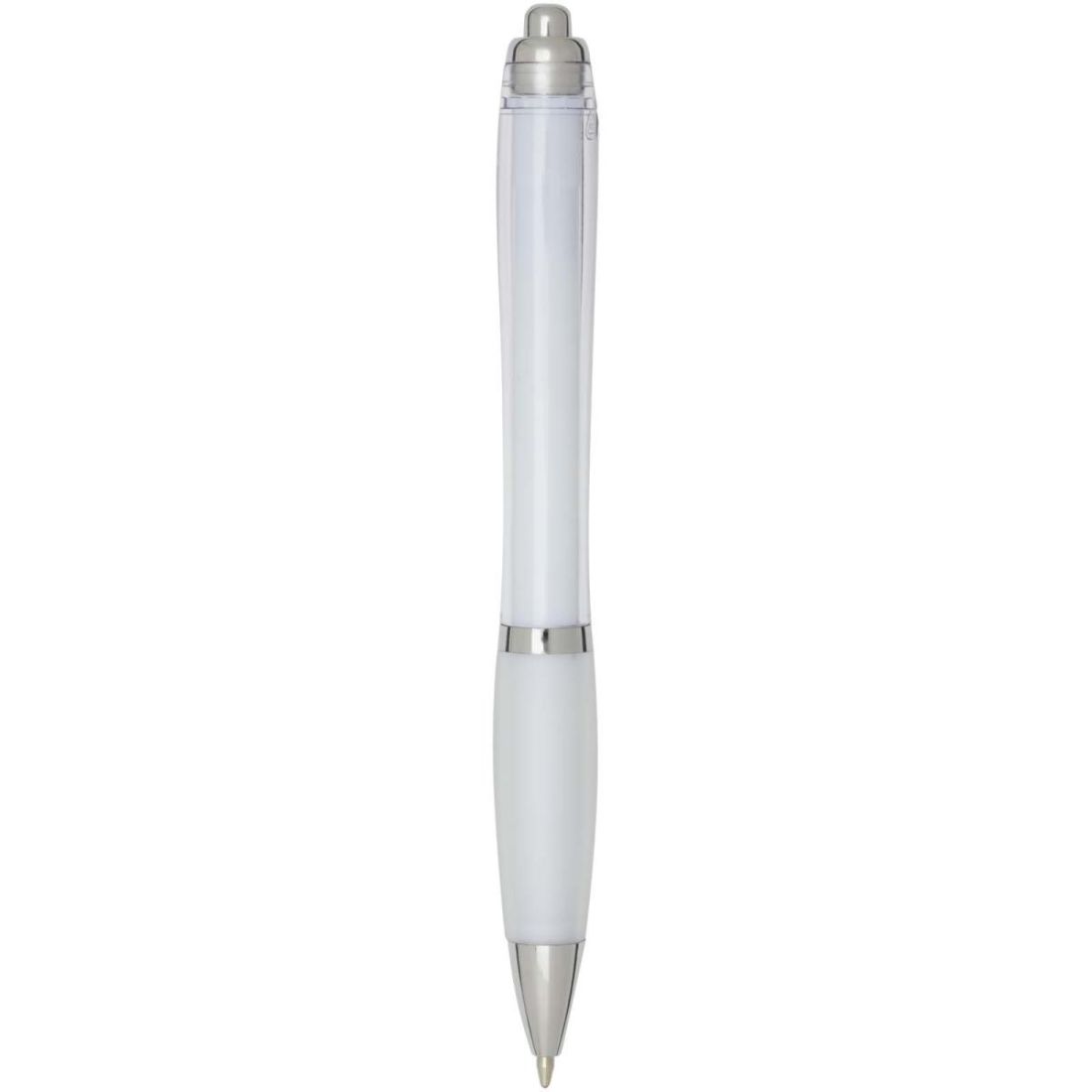 El bolígrafo de plástico reciclado con mecanismo de clic presenta un elegante diseño curvado con cuerpo de color transparente y adornos plateados y una empuñadura blanda del mismo color para escribir con comodidad. Fabricado con plástico ABS reciclado con certificado RCS, ayuda a reducir el uso de materias primas y mantiene su durabilidad. En la parte trasera aparece el logotipo de rABS, que destaca su contenido reciclado. Color de la tinta: Azul. Tamaño de la punta: 1,0 mm. Longitud de escritura: 1000 metros.