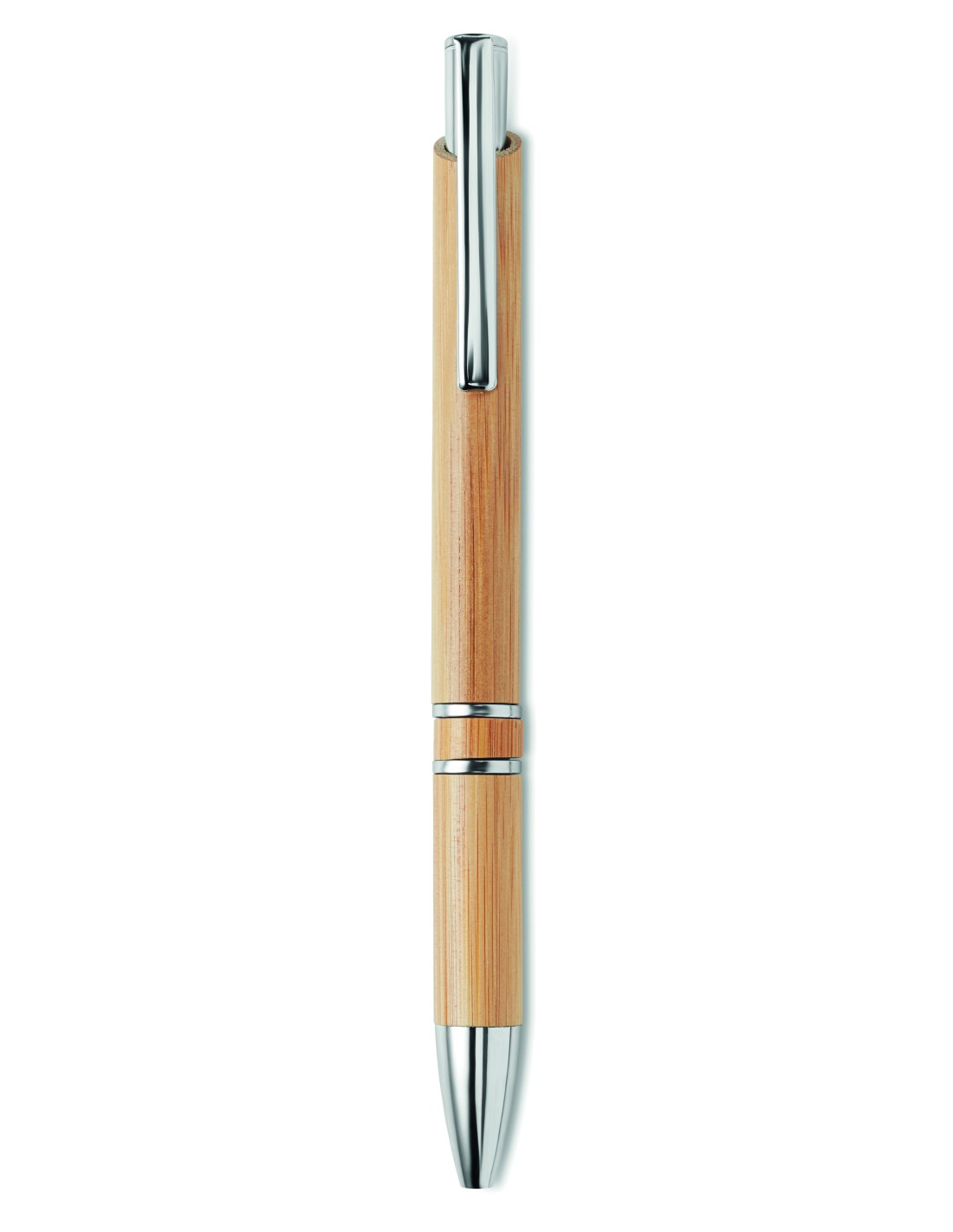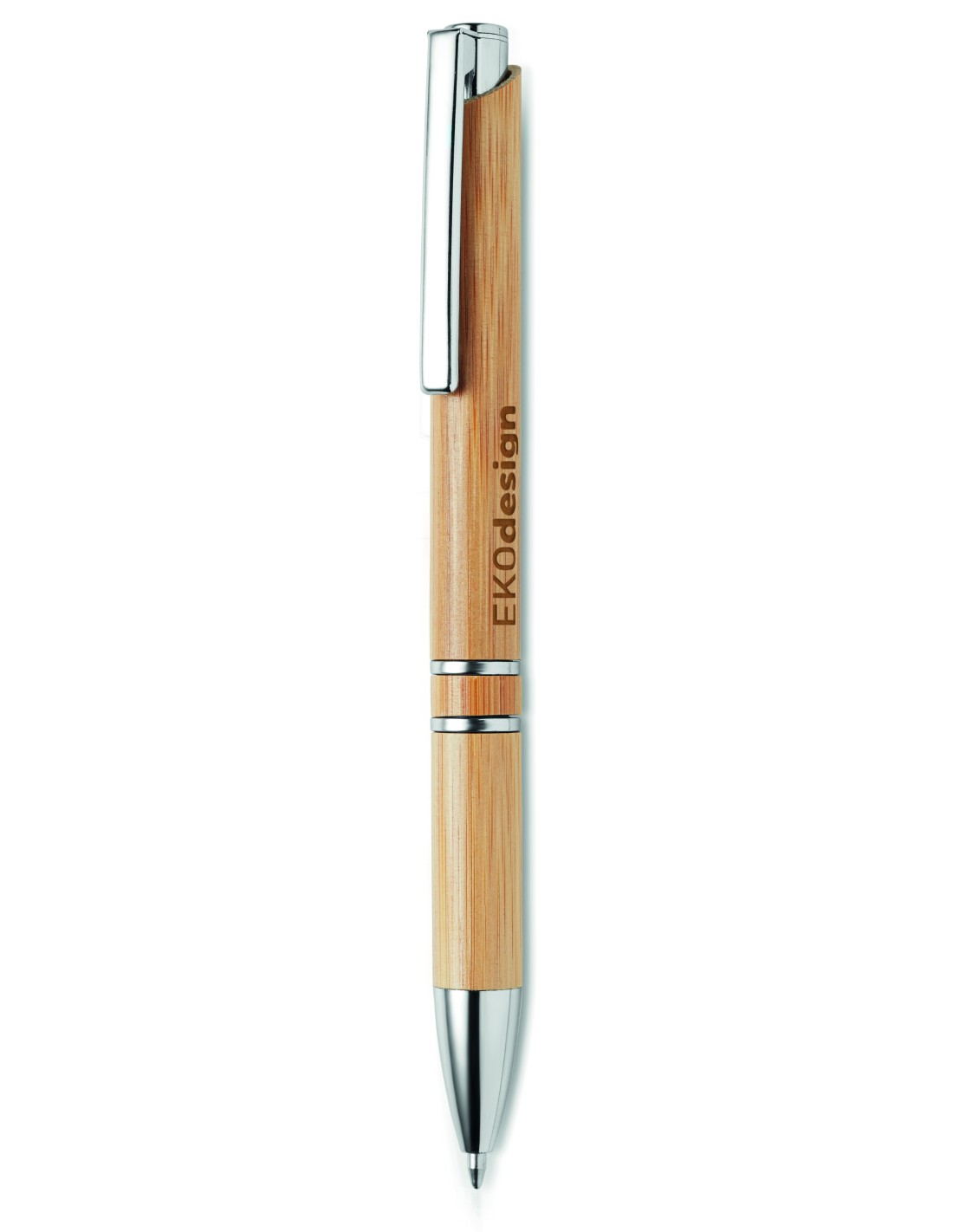 Bolígrafo de bambú con pulsador en aluminio. Tinta azul. El bambú es material natural, el color del articulo puede variar.