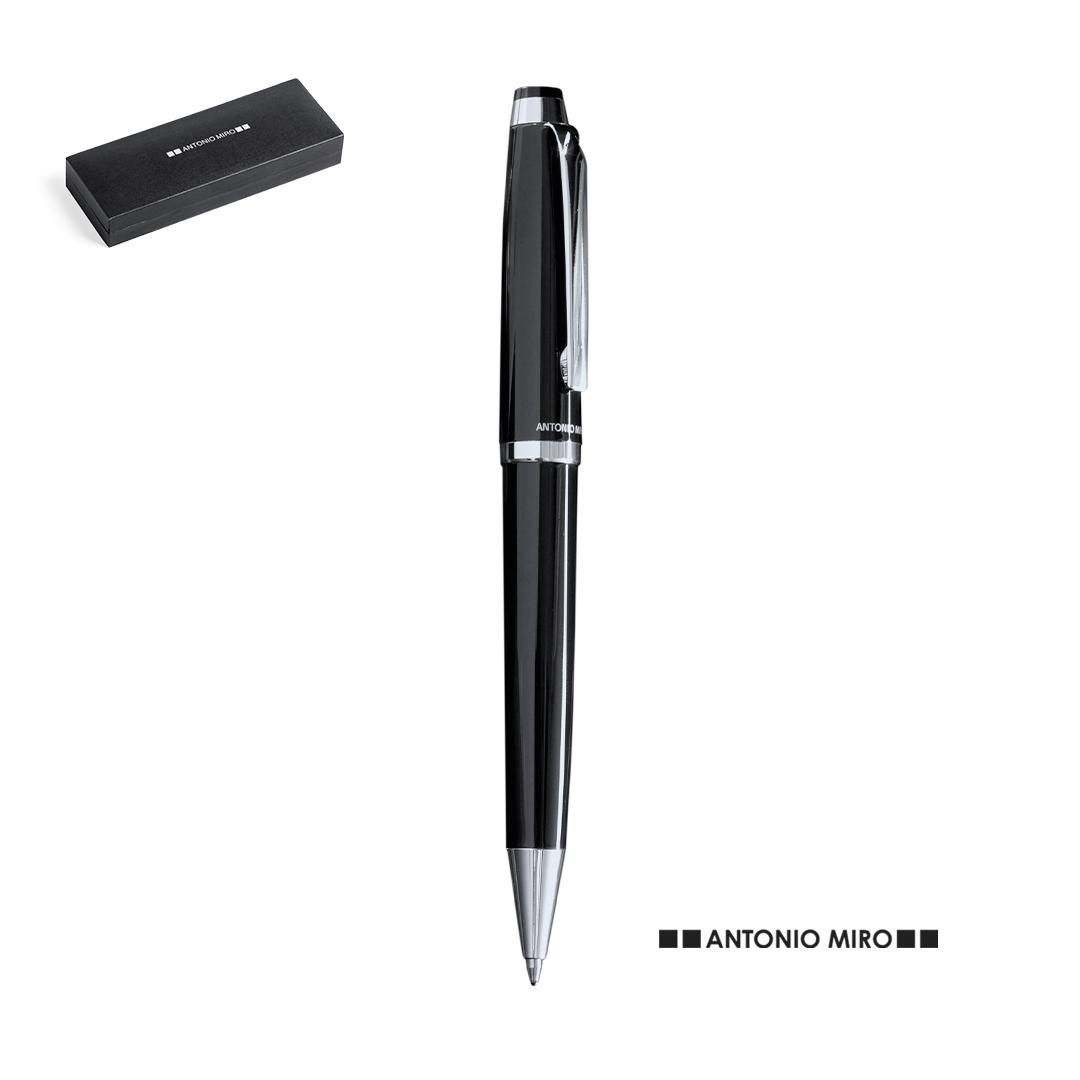 Bolígrafo de Antonio Miró en elegante diseño bicolor y suave cuerpo metálico en sobrio color negro. Con logotipo de la marca encima de la anilla, clip y punta en acabado plateado brillante. Presentado en estuche individual en color negro con logotipo de la marca. De cartucho jumbo con tinta azul.