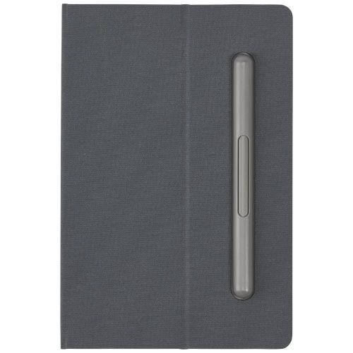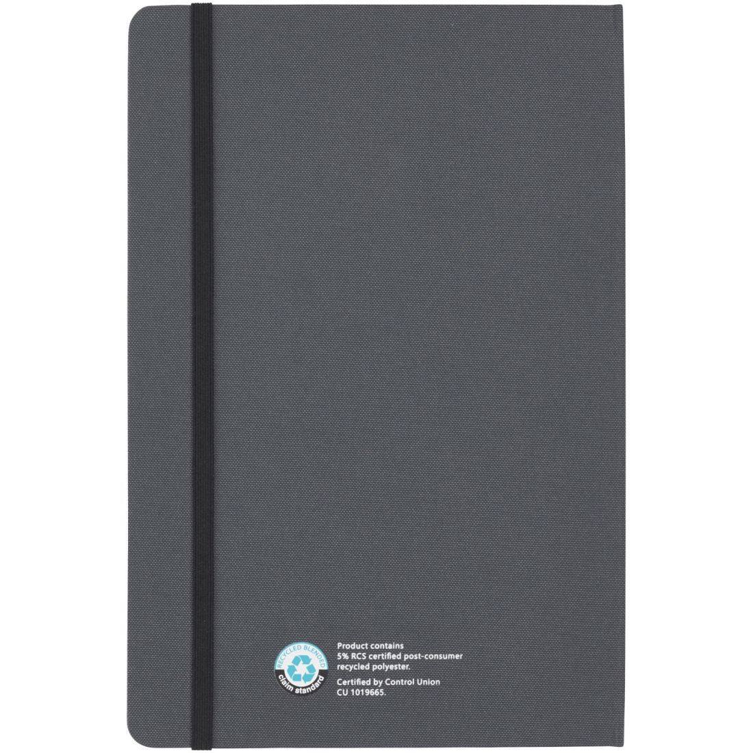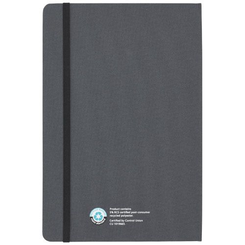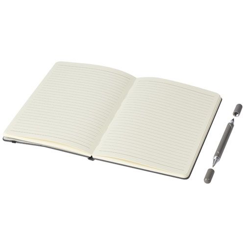 El set de bolígrafo y libreta cuenta con certificación RCS y está parcialmente fabricado con poliéster posconsumo reciclado, por lo que es una opción más sostenible al reducir el uso de materia prima virgen. Dispone de una tapa plegable que lo convierte en un soporte para el móvil. Incluye un bolígrafo de tinta azul y 80 hojas rayadas de papel reciclado de 80 g/m² en color crema procedente de fuentes sostenibles. La longitud de escritura del bolígrafo es de 1000 metros.