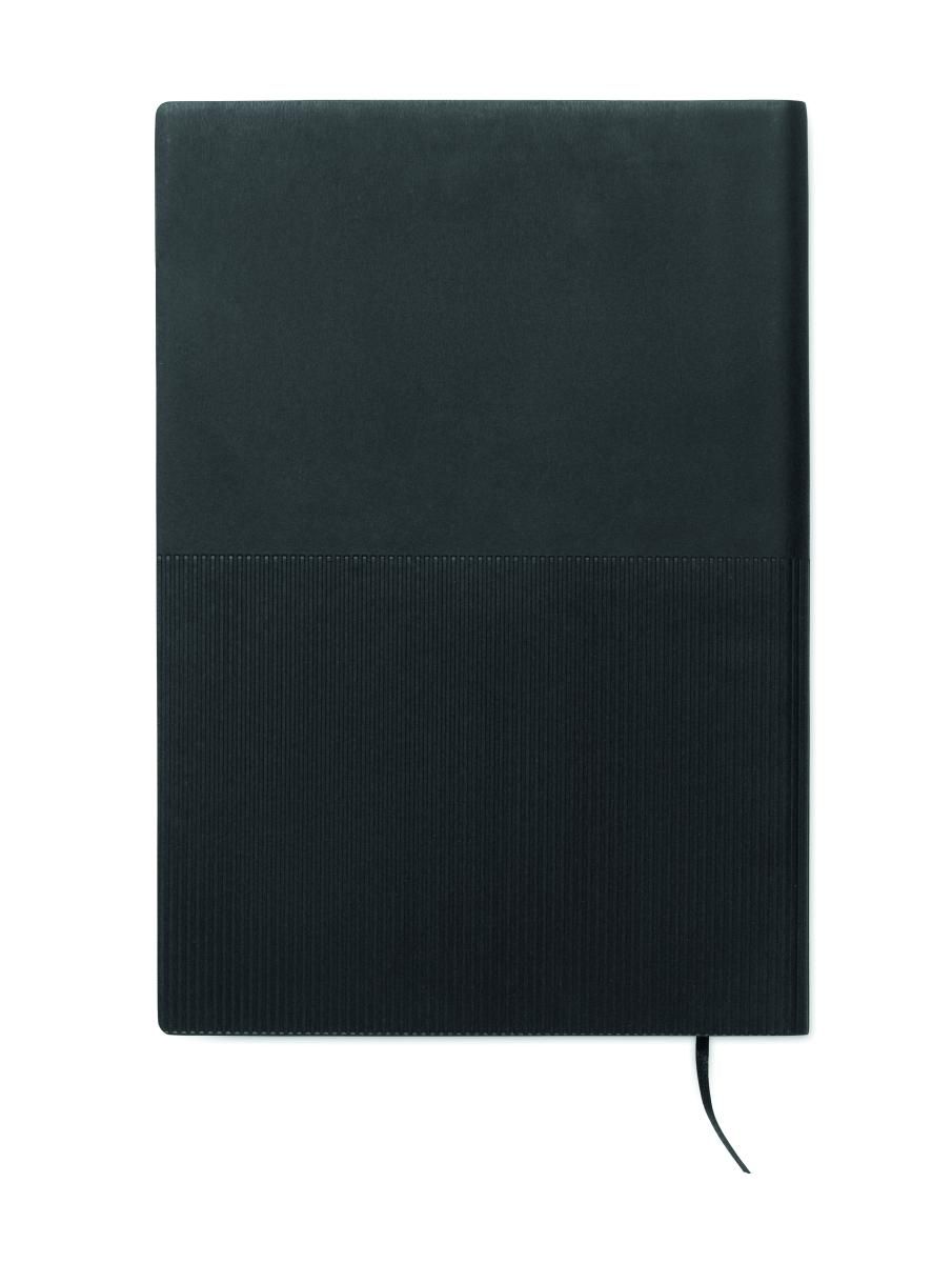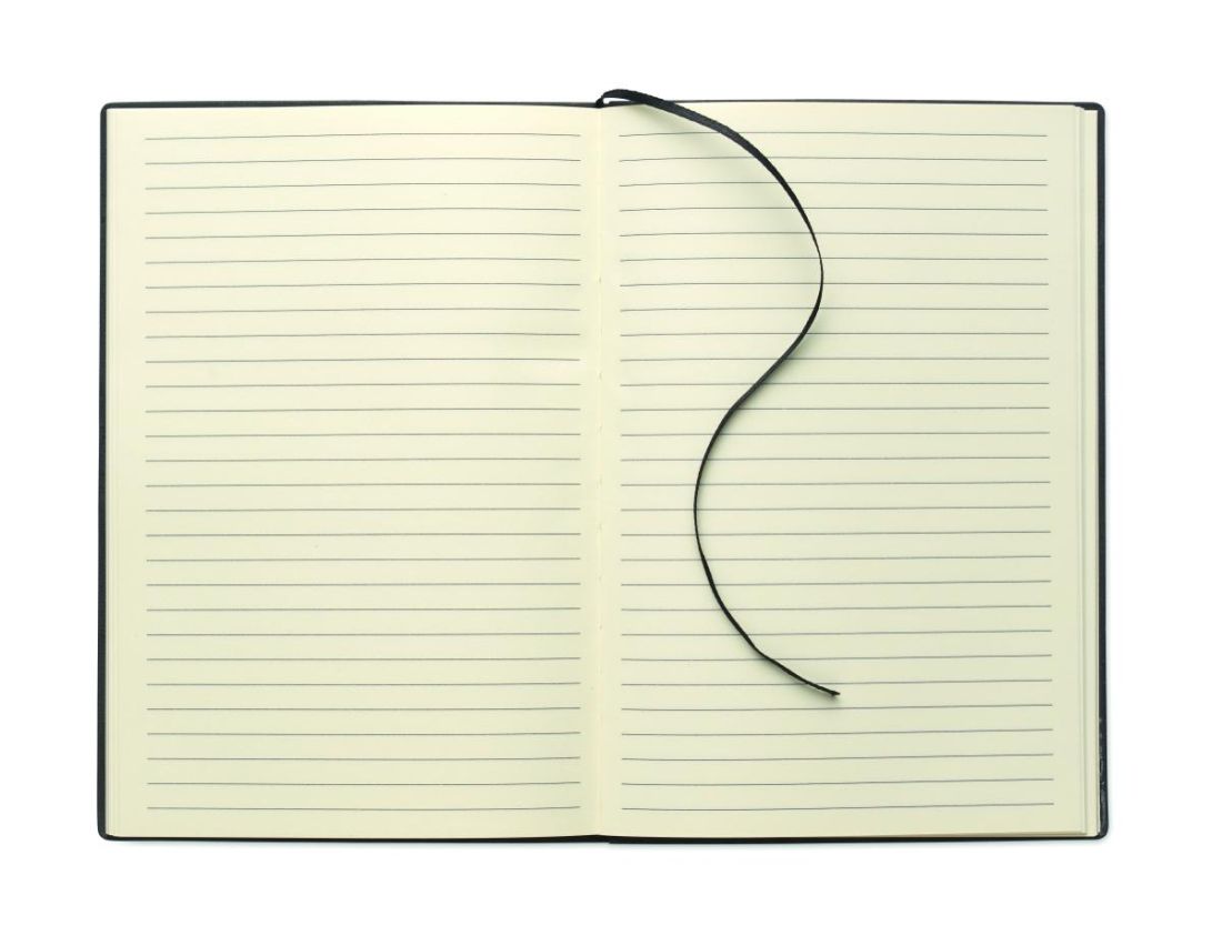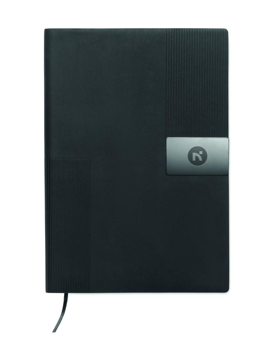 Libreta A5 con cubierta de soft PU. 160 páginas de papel reciclado rayado (80 hojas). Banda elástica y cinta marcapáginas a juego. Detalle de hierro metálico en la parte delantera.