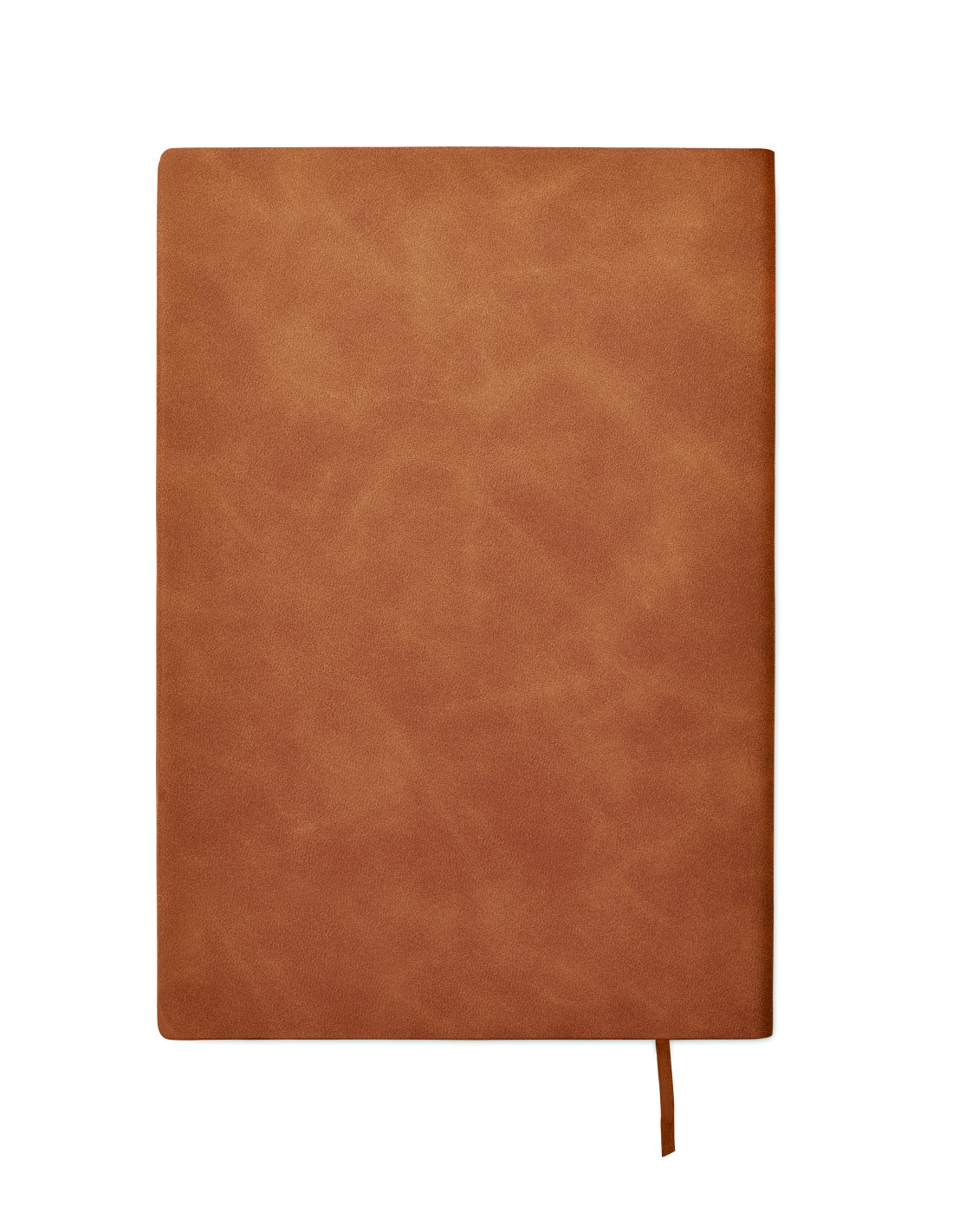 Libreta A5 con suave cubierta acanalada de PU ahumado en 40% postconsumo reciclado y 60% PU con parche de PU liso. 160 páginas rayadas, papel reciclado de 70 g/m² (80 hojas). Marcapáginas de cinta de poliéster del mismo color.