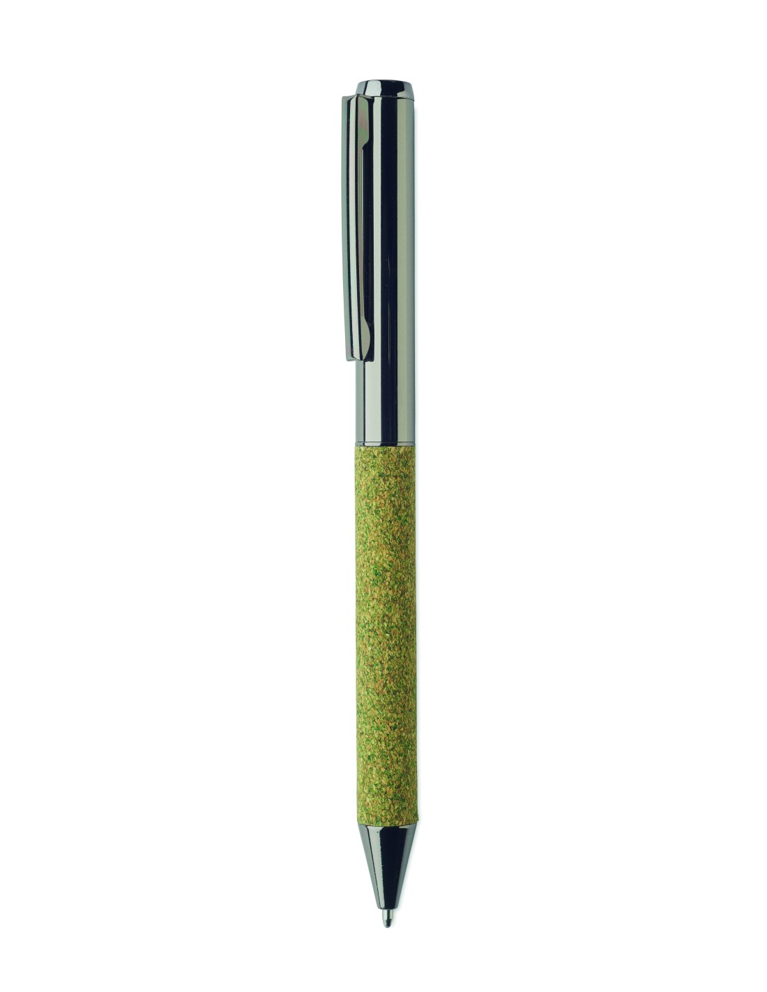 Set de libreta A5 de tapa dura y 160 páginas de papel reciclado rayado (80 hojas/70 g/m²) , bolígrafo metálico giratorio y llavero. Detalle fabricado con un 20% de posos de té, un 30% de corcho y un 50% de tela de poli algodón. Detalle metálico en la correa elástica. FSC®-certified | FSC MIX CREDIT, N7.1, FSC-C213206