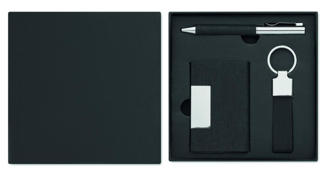 Set de regalo de 3 piezas en caja de regalo. Incluye bolígrafo metálico con detalle de poliéster RPET, llavero de poliéster RPET y tarjetero de poliéster RPET con placa metálica. Tinta azul.