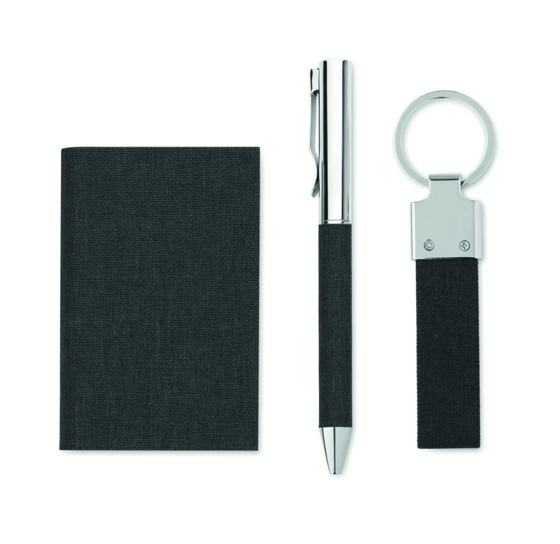 Set de regalo de 3 piezas en caja de regalo. Incluye bolígrafo metálico con detalle de poliéster RPET, llavero de poliéster RPET y tarjetero de pol…