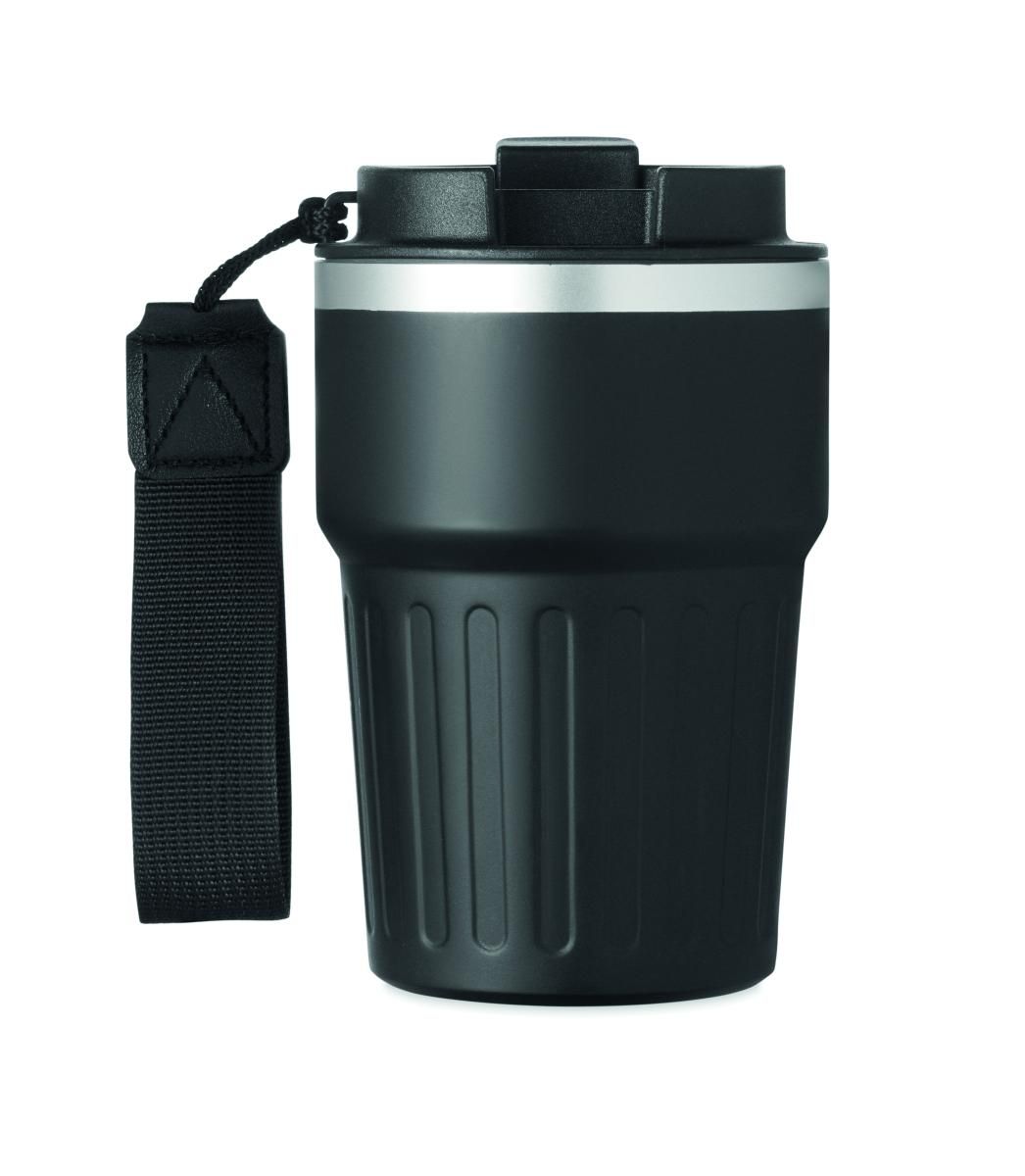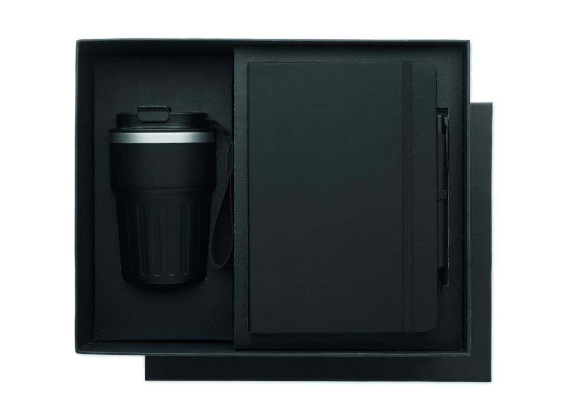 Set de regalo con cuaderno A5, bolígrafo de aluminio reciclado y vaso de 350 ml de acero inoxidable reciclado de doble pared con tapa de PP y correa en caja de regalo.